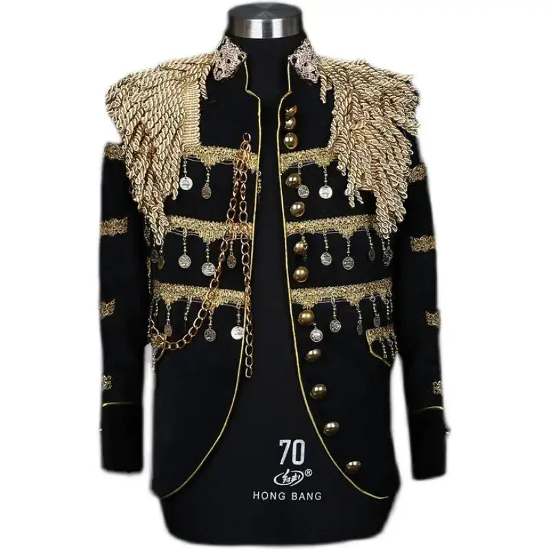 The most eye-catching design lies in the tassel decorations on the shoulders and the front of the garment - long metallic tassels droop symmetrically, swaying gracefully with every movement. Paired with the gilded buttons and double-breasted buttons on the front of the garment, it replicates the solemnal and luxurious style of the presidential uniform. The cuffs feature exaggerated trumpet-shaped openings, decorated with satin trim in the same color. Embroidered badges (customizable) at the details enhance the character's recognition, as if the images of nobles or powerful figures from historical dramas were directly brought onto the stage. It is suitable for scenarios such as theatrical performances, theme parties, and retro balls, and is especially suitable for playing roles such as presidents, generals, and nobles. Paired with high-top leather boots or patent leather Oxford shoes, it can fully restore the retro military uniform look. If paired with a leather belt and medal accessories, it can better highlight the character's sense of power and dramatic tension. It offers three classic tones: navy blue, Burgundy and dark green. The sizes range from L to 3XL. The loose cut is suitable for multi-layer innerwear. From the stiffness of the fabric to the drape of the tassels, every detail of the craftsmanship serves the stage performance, allowing the wearer to instantly immerse themselves in the role and control the entire venue with a domineering posture.