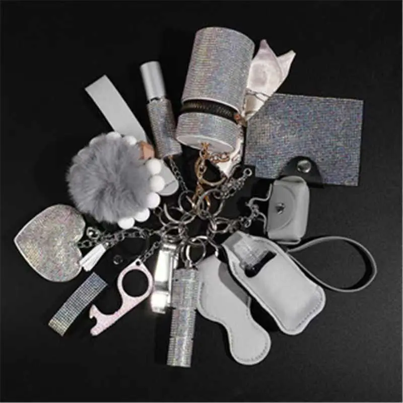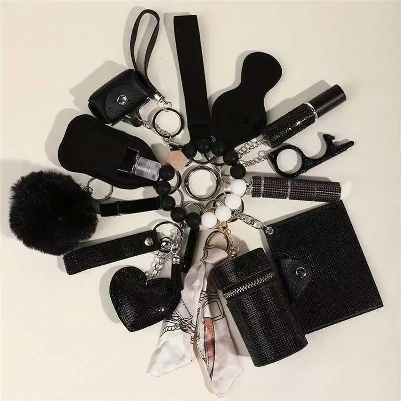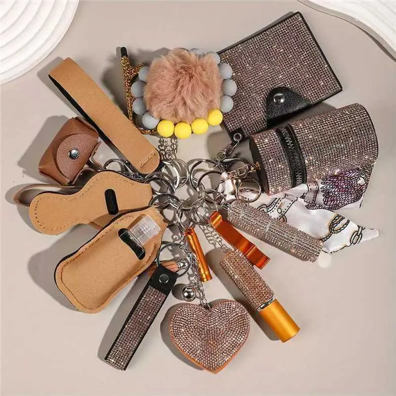 NewDesignHotWholesaleRhinestoneWomenSelf-DefenseAnti-WolfKeychain17pcsSetPompomsAlarmSelfDefense