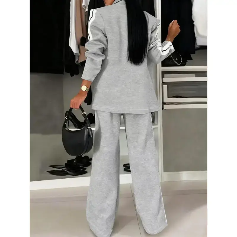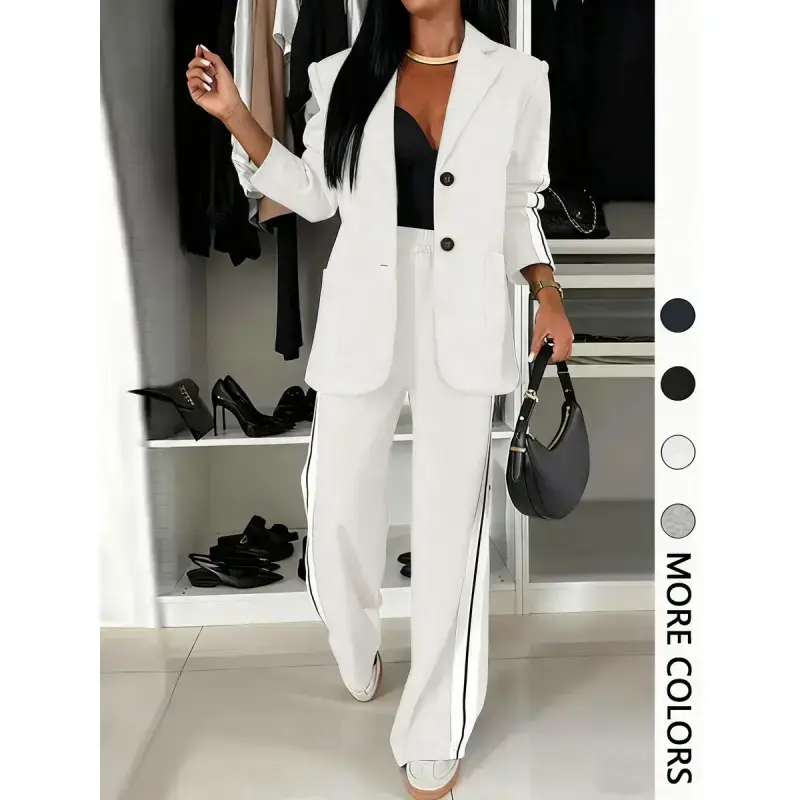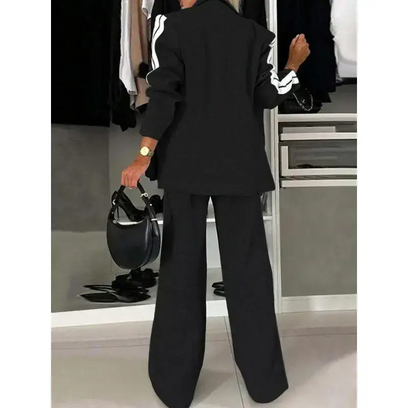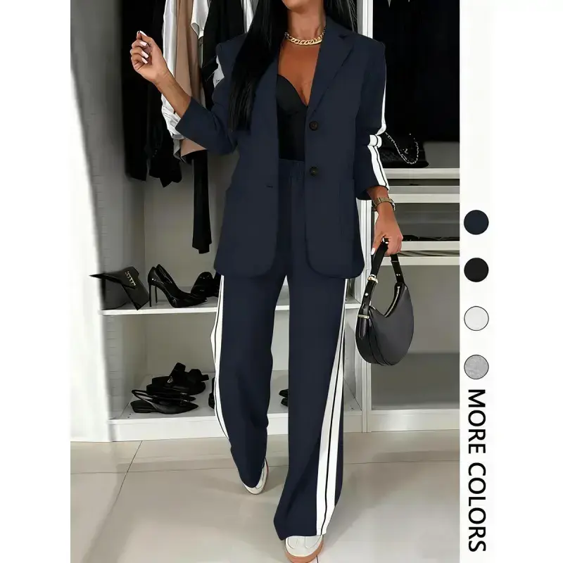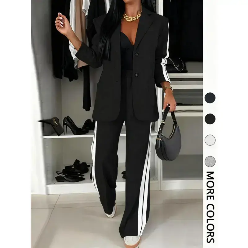 [Unique Stripes]: Features eye-catching striped patterns, providing a distinct look that sets it apart from other suits. [Comfortable Fit]: Crafted with a fitted cut, this suit ensures a sleek silhouette without sacrificing wearable ease. [Regular Length]: Top and pants are designed with regular length, ensuring a balance between sophistication and everyday ease. [All Season Wear]: Suitable for all seasons, offering versatility for different settings and occasions throughout the year. [Structured Ensemble]: Includes a matching blazer and wide-leg trousers, presenting a cohesive, complete outfit for various occasions.