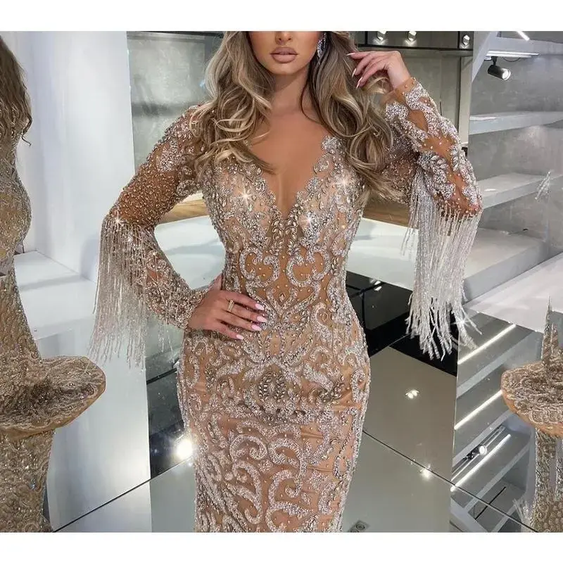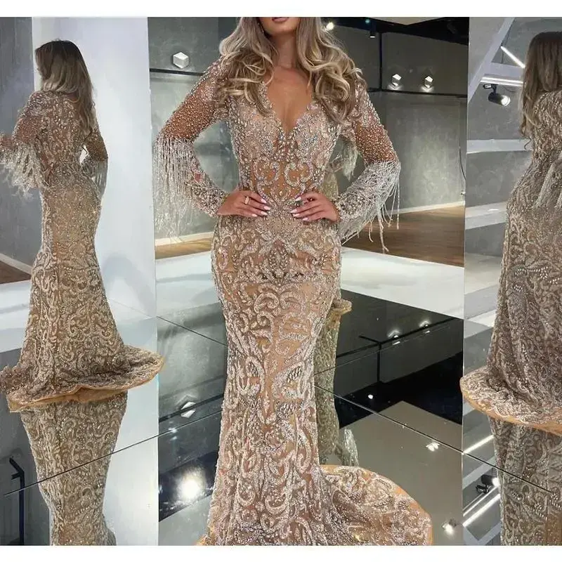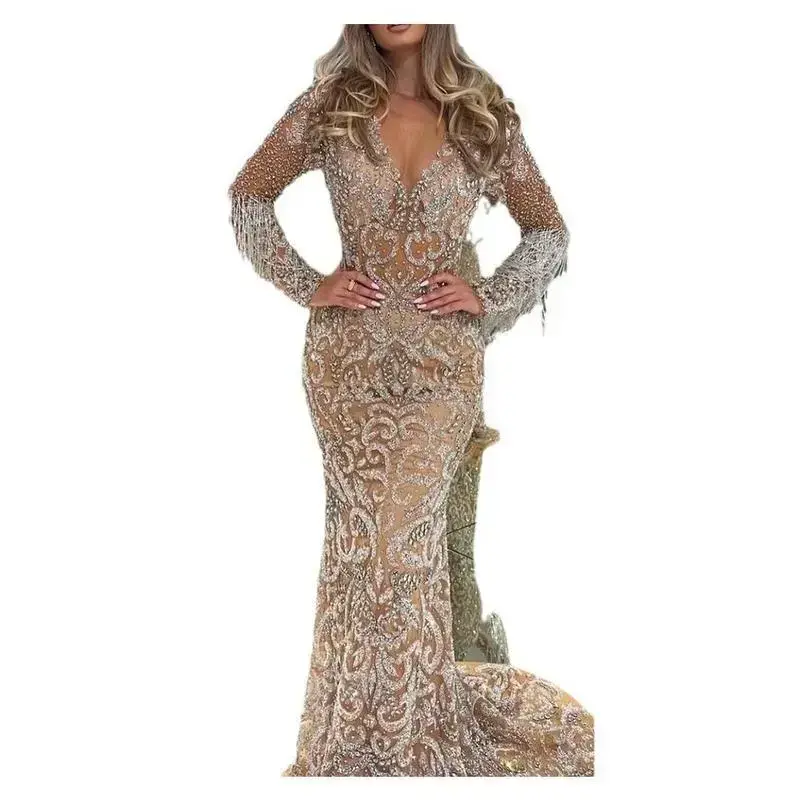 Product Description:/Command every gala in this SPRING2025 Euro-American evening gown featuring a figure-sculpting mermaid tail shimmering gold-sprinkled fringe and sensual slit Crafted with lightweight fabric for graceful movement its blend of elegance and boldness shines at weddings red carpets or black-tie events Radiate confidence with timeless sophistication/Key Features:/SPRING2025 Euro-American formalwear/Mermaid silhouette with gold-sprinkled fringe accents/Elegant high slit and bodycon design/Breathable lightweight fabric for all-night comfort/Versatile for weddings galas red carpet events/The above content is the product introduction. you a happy shopping!/Edit/Share