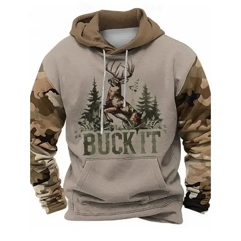 Men's Full Coverage Camouflage Hooded Sweatshirt with Deer Hunting Pattern and 'Bu It' Words - Suitable for All Seasons Brown/Green Camouflage Jacket, Comfortable Pullover, with Pockets, Ideal for Hunting, Outdoor and Casual Wear (Regular Fit, Machine Was