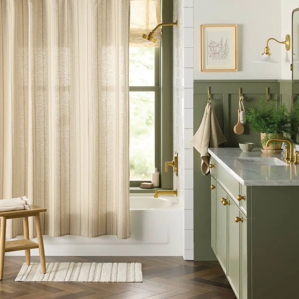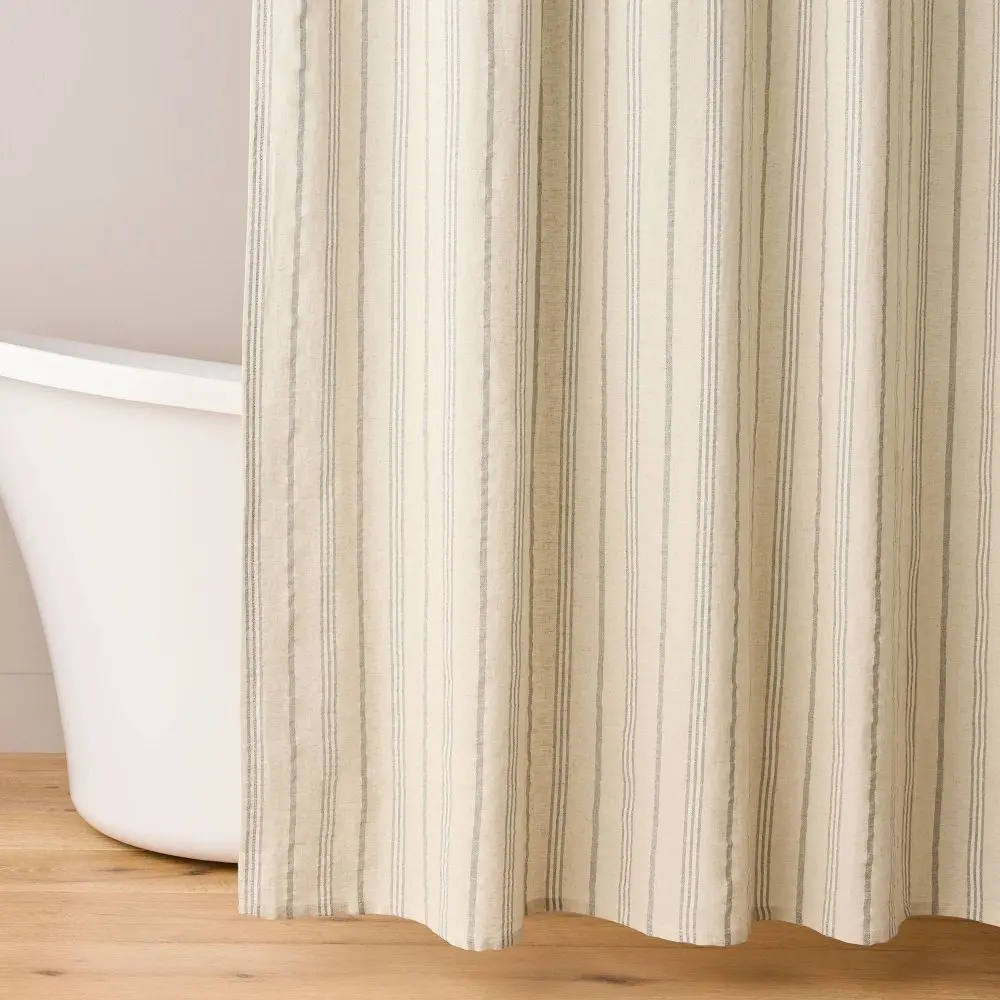 Elevate the look and feel of your bath space with this Vertical Stripe Shower Curtain from Hearth & Hand with Magnolia. The shower curtain is adorned with blue vertical stripe pattern on a natural backdrop to elegantly enclose your bathtub or shower stall for added privacy and style. Plus, the shower curtain comes with a buttonhole top for easy hanging around your shower stall.
