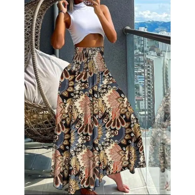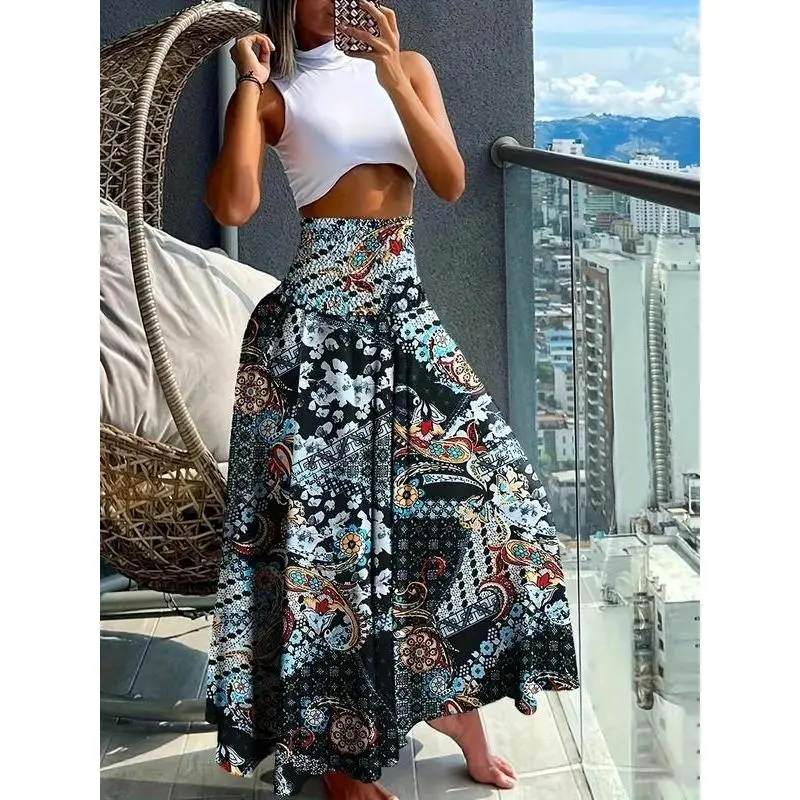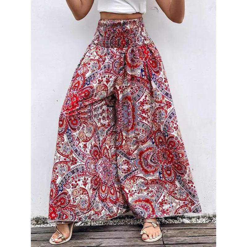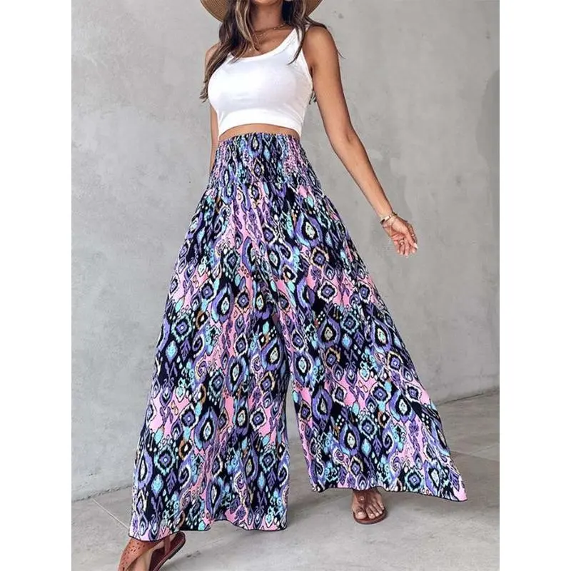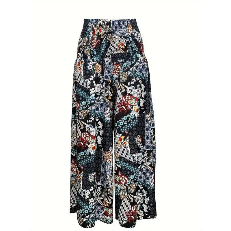 Women's Ethnic Pattern Shirred Waist Wide Leg Pants, Boho Casual High Waist Trousers for Daily Holiday Vacation Wear, Ladies Bottoms for All Seasons, Boho Fashion Trousers