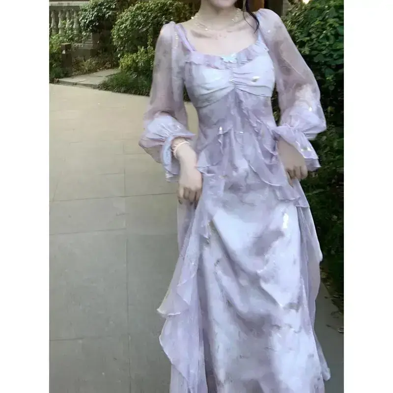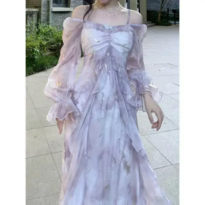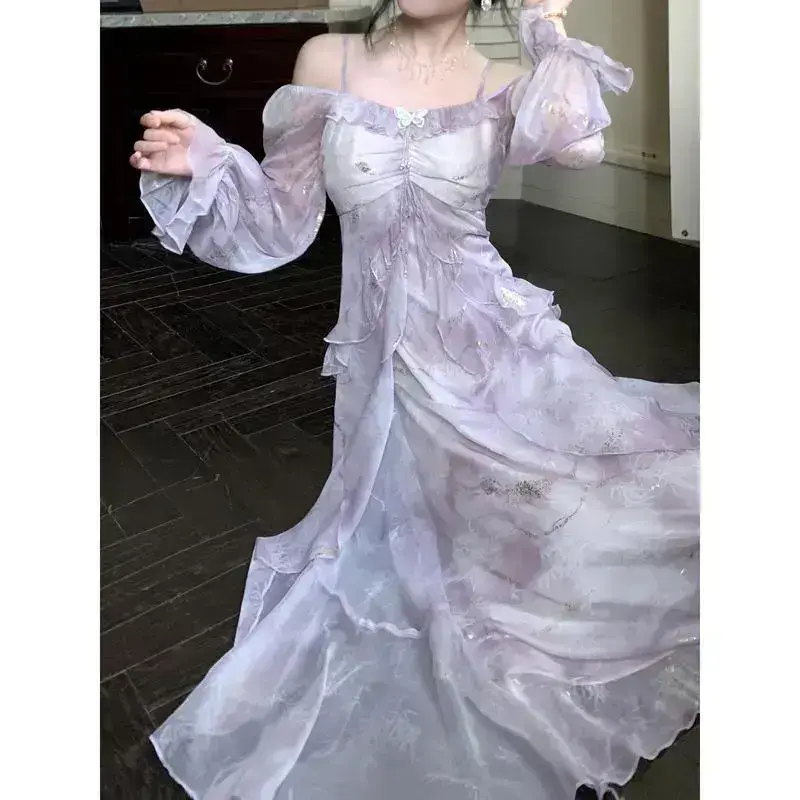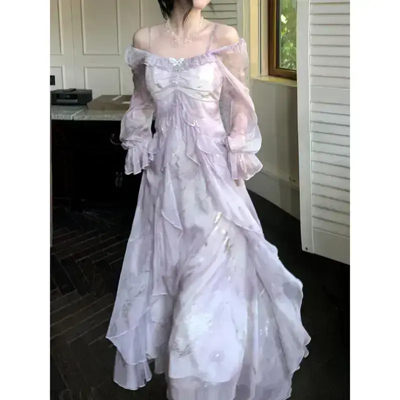 Elegant Lavender Blue Gradient Floral Print Long Sleeve Dress,With ruffle details - A Character Outline,Off-shoulder neckline,Polyester Fabric,Suitable for Spring and Summer,Lavender-colored jumpsuit Casual Womenswear wedding guest purple dress
