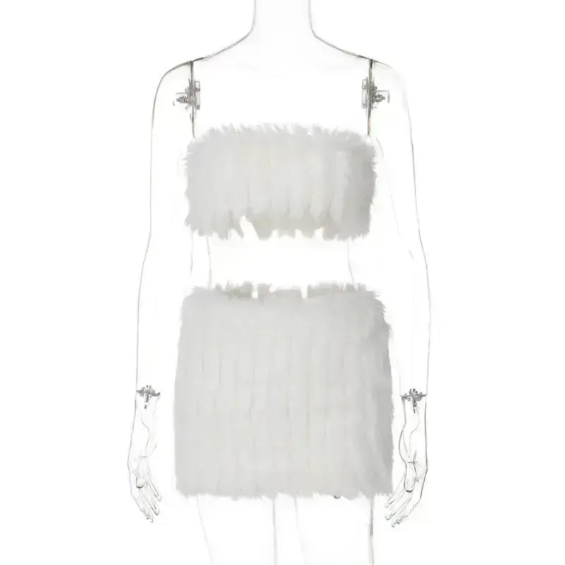 Furry 2 Piece Women's Matching Sets - Strapless Sexy Slim Cute Crop Top & Mini Skirt - Winter Outfits for Women, Minimalist Style, White Short Basic Can be used with raincoat