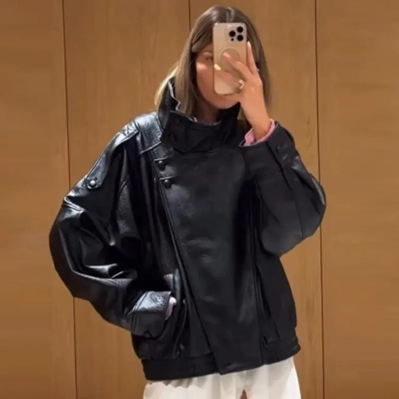 Black PU Leather Jacket Women's jacket autumn 2025 Oversize Asymmetrical Zipper outerwears new in coats & jackets long sleeve Biker Jacket Street Style Jacket puffer