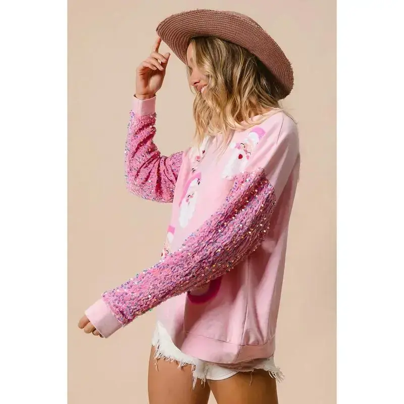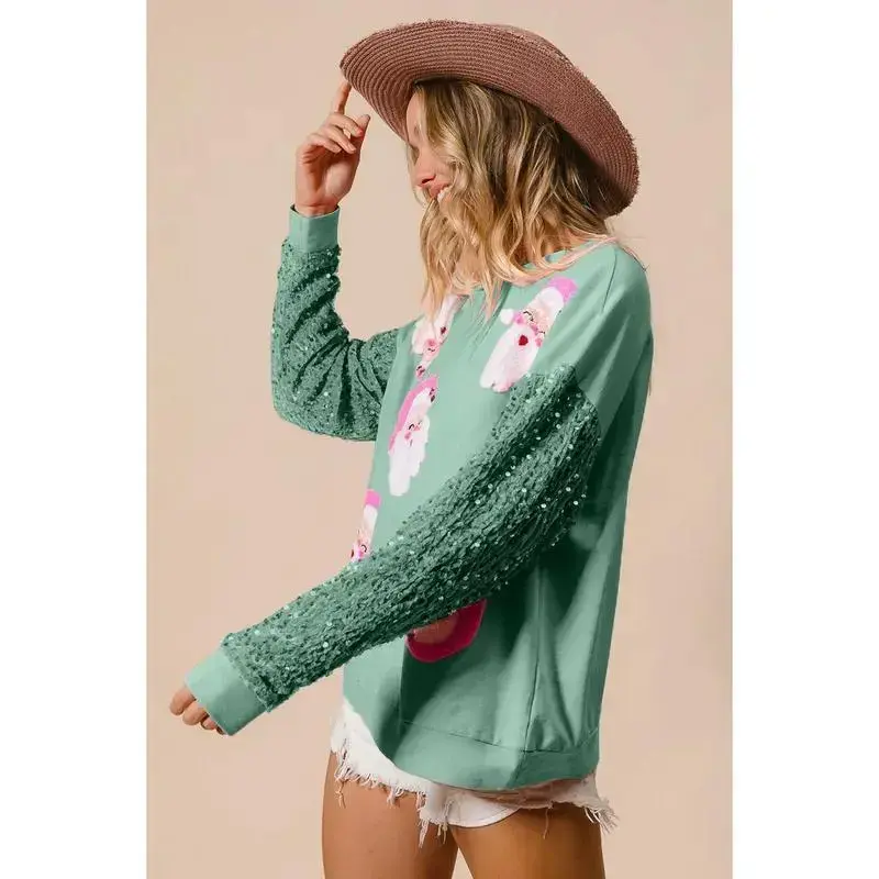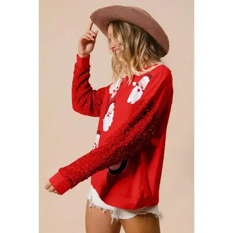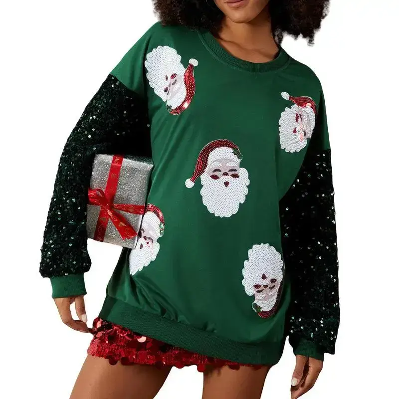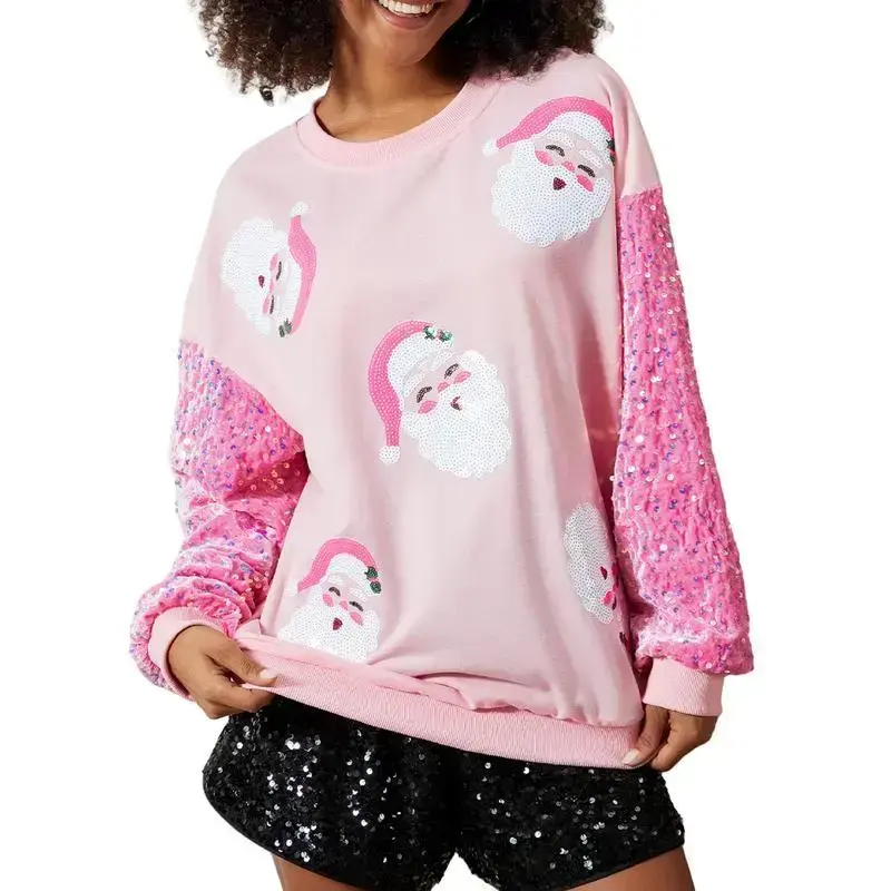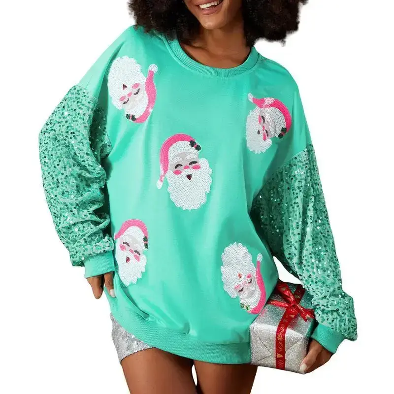 Women Cute Santa Claus Sweatshirt Christmas Sparkly Sequin Patched Graphic Print Shirt Crewneck Long Sleeve Pullover Sweatshirts Tops Glitter Funny Xmas Holiday Clothes