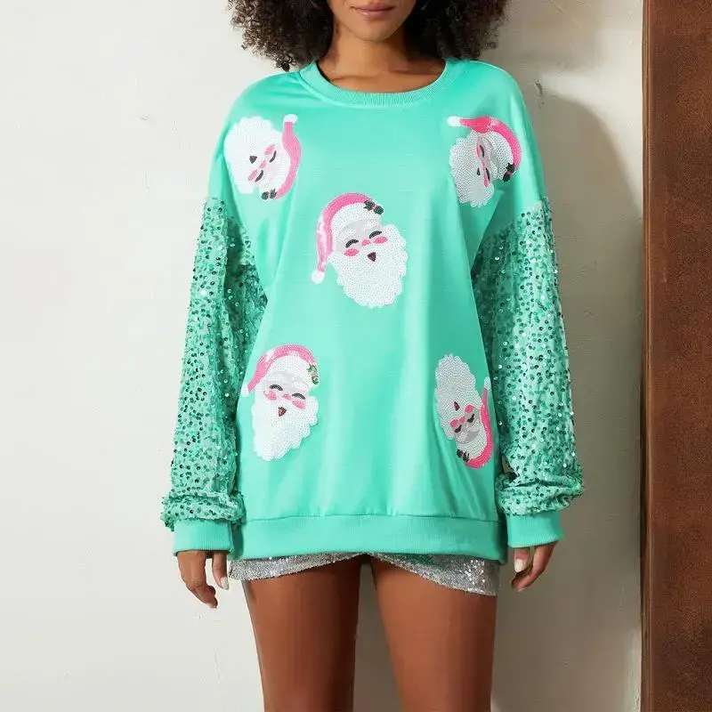 Womens Christmas Santa Sweatshirt Sequin Long Sleeve Crew Neck Pullover Tops Casual Streetwear Women Cute Santa Claus Sweatshirt Christmas Sparkly Sequin Patched Graphic Print Shirt Crewneck Long Sleeve Pullover Sweatshirts Tops Glitter Funny Xmas Holiday Clothes S Length: 67 Bust: 108 Sleeve: 50 Shoulder: 63 M Length: 68 Bust: 112 Sleeve: 51 Shoulder: 64 L Length: 69 Bust: 118 Sleeve: 52 Shoulder: 66 XL Length: 70 Bust: 124 Sleeve: 53 Shoulder: 67 XXL Length: 71 Bust: 128 Sleeve: 54 Shoulder: 68 S Length: 26.38 Bust: 42.52 Sleeve: 19.68 Shoulder: 24.8 M Length: 26.77 Bust: 44.09 Sleeve: 20.08 Shoulder: 25.2 L Length: 27.17 Bust: 46.46 Sleeve: 20.47 Shoulder: 25.98 XL Length: 27.56 Bust: 48.82 Sleeve: 20.87 Shoulder: 26.38 XXL Length: 27.95 Bust: 50.39 Sleeve: 21.26 Shoulder: 26.77 Materials: 100% Elastane Pattern: Santa Claus Print, Sequin Color: Pink/Light Green/Dark Green/Red 1 * Sweatshirt 1. Please understand there may be a 1-2 cm deviation exist. 2. Due to the lighting and monitors, there is a slight difference between the picture and the real item.