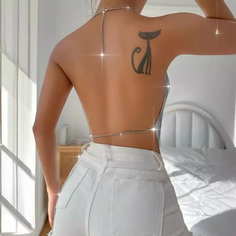 Women's New Sexy Backless Metal Chain Tube Top Sequin Sling Cowl Neck Halter Top Sleeveless Metallic