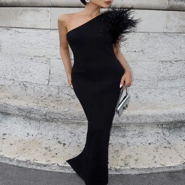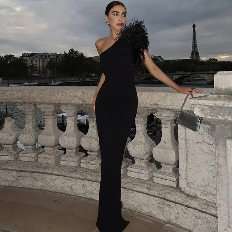 Fabric name:Silk of milk/Pattern: Solid Color/Craft: Collage/Split/Origin: Guangzhou/Style: off-shoulder style/Combination form: single piece/Skirt length: long skirt/Skirt: hip-covered skirt/Collar type: oblique collar/Sleeve type: sleeveless/Sleeve length: sleeveless/Waist shape: mid-waist/Popular elements: feathers/Listing year/season: 2025 summer/Main fabric composition: polyester (polyester fiber)/Main fabric composition 2: Spandex Color: black, fabric composition: 83% polyester, 17% spandex Large size weight: 0.31/Size: S, M, L/Style type: Private server celebrity/Plate: Screw/Main fabric composition content: 80% (inclusive) - 90% (excluding)/Style:Famous style/Elasticity: High elasticity Style type: elegant temperament