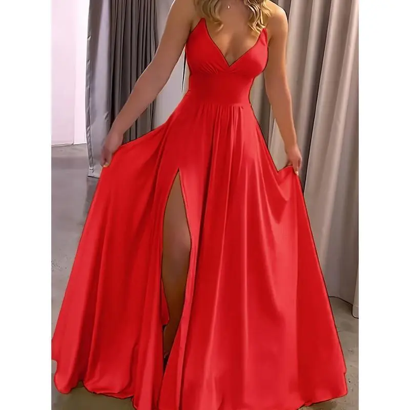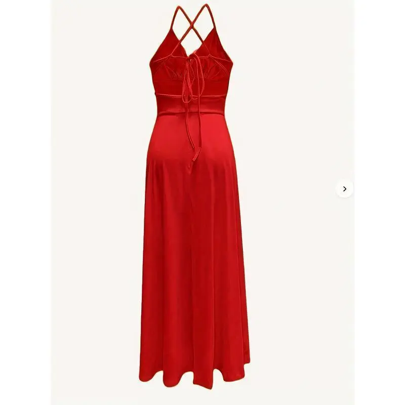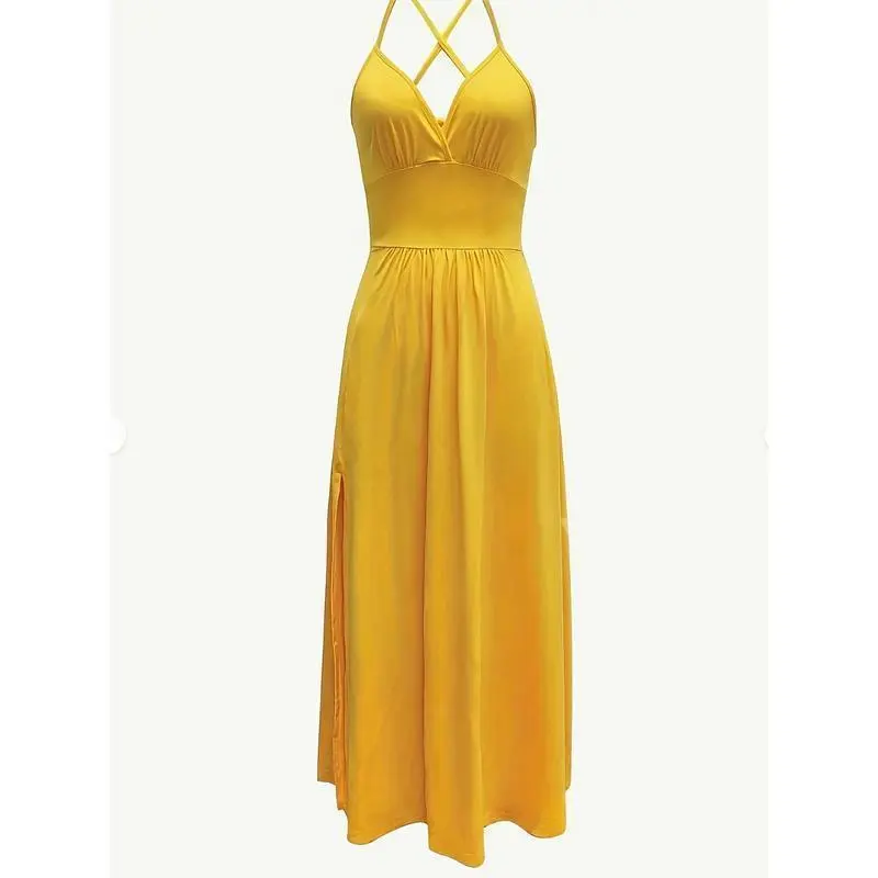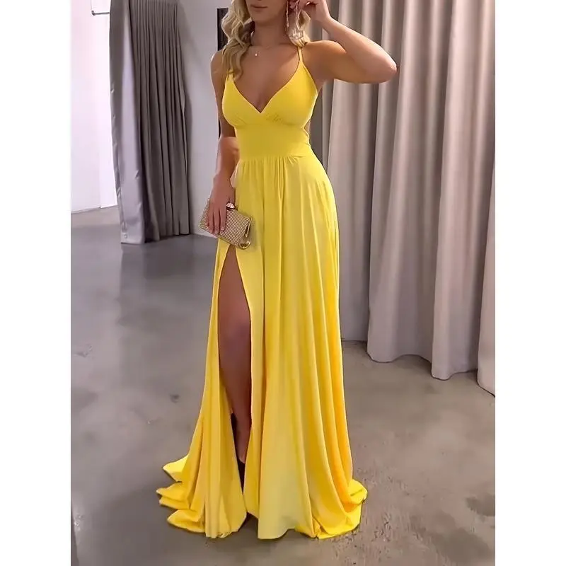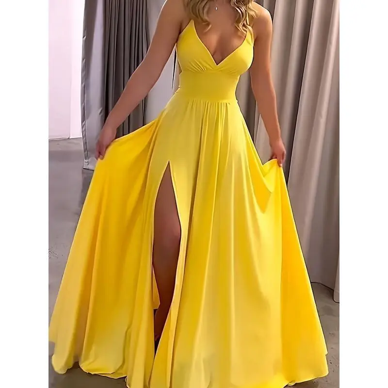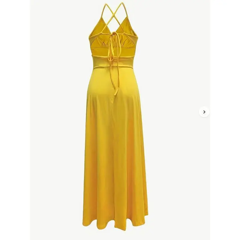 Elegant High-Slit Maxi Cami Dress for Women - Solid Color Bright Yellow, Deep V-Neck, Ruched Bodice, Flowing Design, Perfect for Spring/Summer/Fall Events