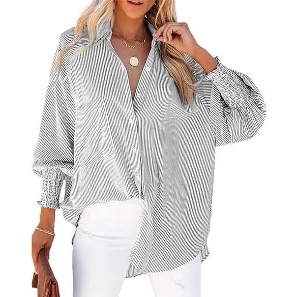 Women's Oversized Button Down Shirts Business Casual Long Sleeve Blouse Work Striped Tops Solid Style
