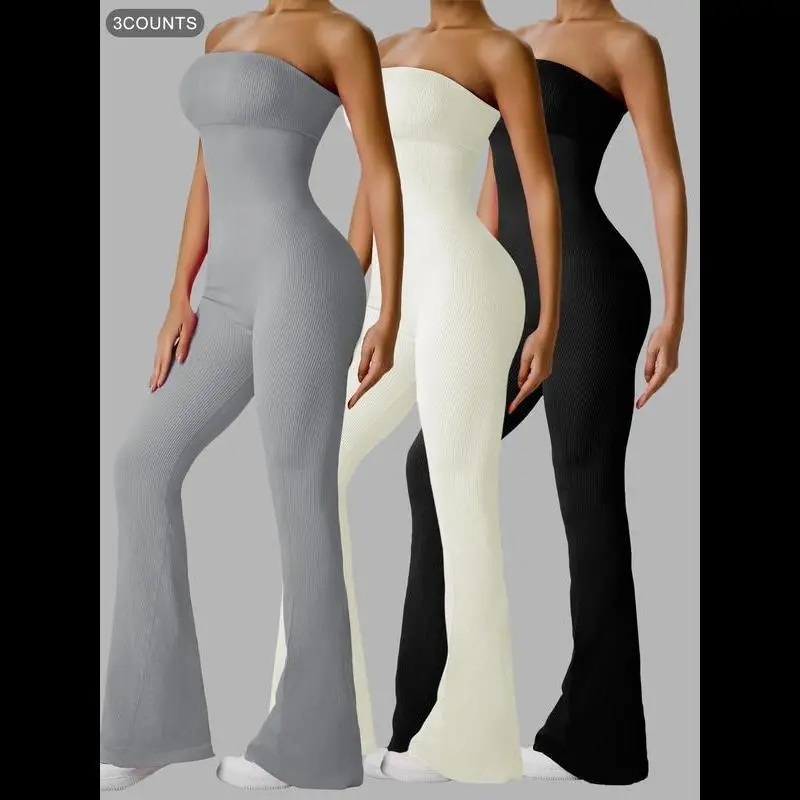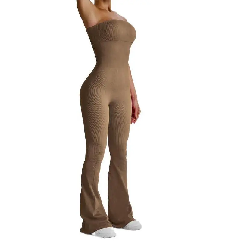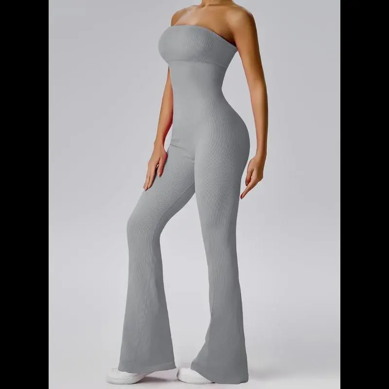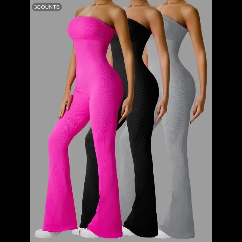[Slim-fitting silhouette]: Crafted for a body-hugging fit that emphasizes natural curves, offering both support and flexibility during workouts./[Slight stretchability]: Incorporates just enough stretch to facilitate a full range of motion without compromising the jumpsuit's shape./[Strapless neckline]: Features a strapless design that highlights the shoulders and collarbone, adding a touch of femininity to functional workout wear./[Knit construction]: The jumpsuit's knit fabrication ensures breathability and comfort, ideal for intense exercise sessions or casual wear./[Machine washable]: Ease of care with machine washability, making it convenient for regular use without the fuss of special washing instructions.