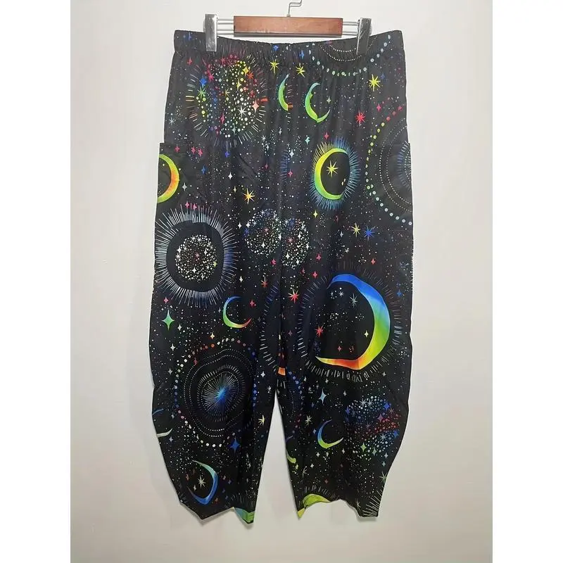 Plus Size Women's Holographic Moon & Star Print Wide Leg Trousers/✨ Elevate your wardrobe with these wide leg trousers! Crafted from 100% polyester, they offer a non-stretch, woven fabric perfect for all-season wear. The galaxy pattern features random holographic moon and star prints, adding a cosmic flair. Machine washable, these bottoms are easy to care for. Ideal for women seeking stylish, versatile clothing./Key Features/Additional Information/The trousers come with convenient pockets, enhancing both functionality and style. They are woven for durability and comfort. Item ID: LF42425. Enjoy the convenience of random printing without compromising on quality or ease of care.