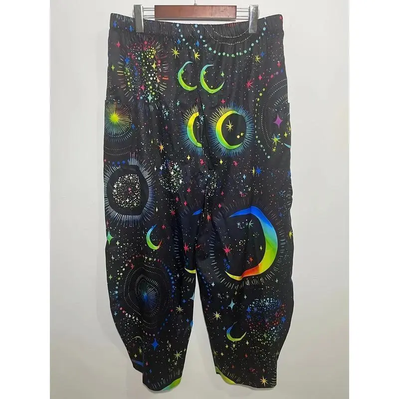Plus Size Women's Holographic Moon & Star Print Wide Leg Trousers with Pockets Polyester Woven Bottoms LF42425 Pants Womenswear Fabric Wideleg Multicolor Galaxy Pattern