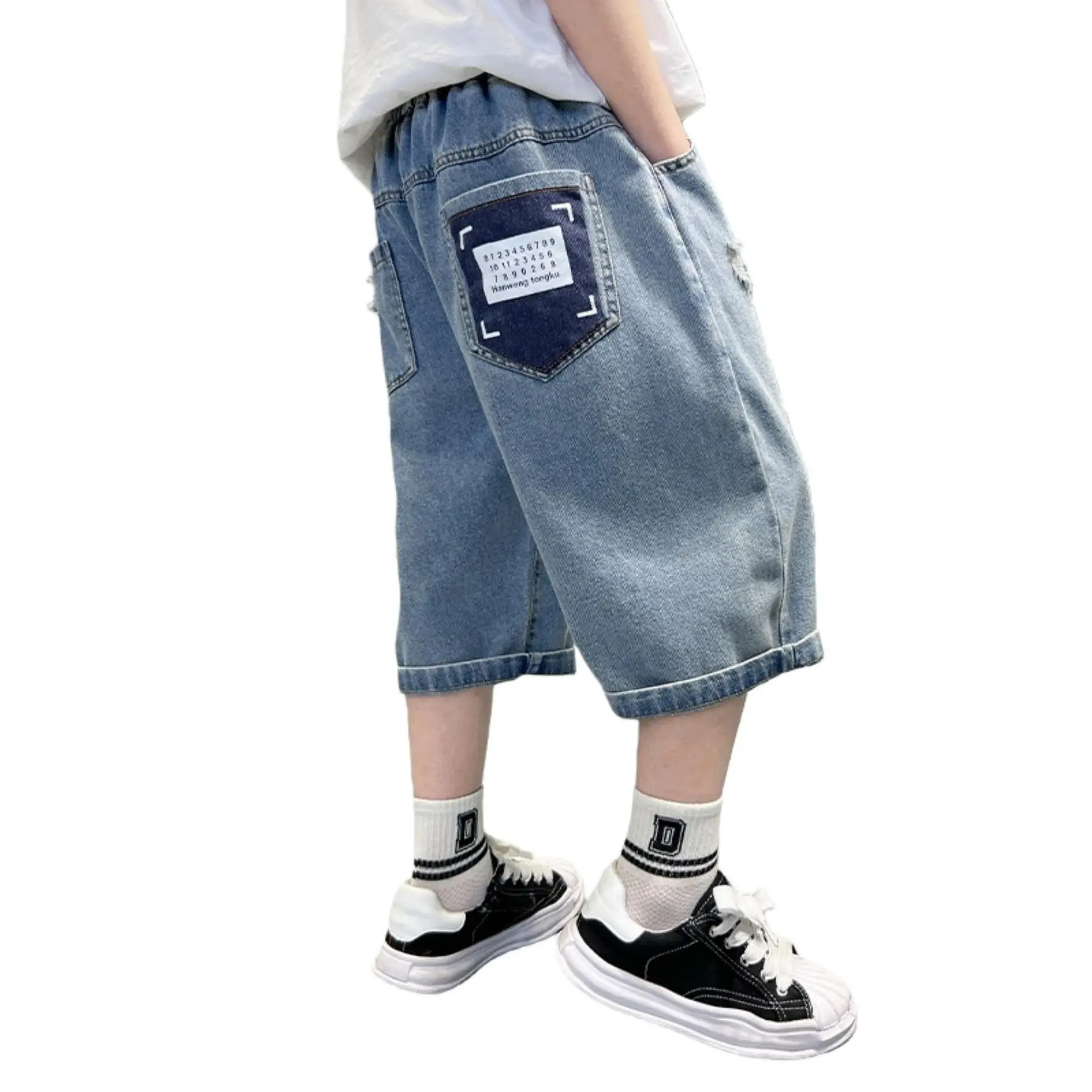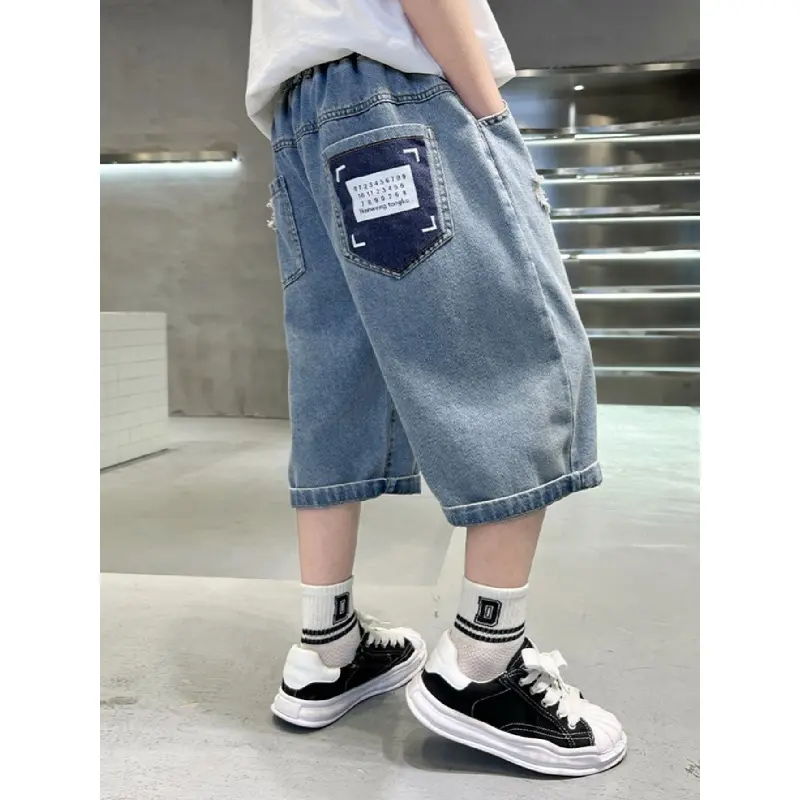 (New)Boys' Faux Denim Pants, a Valentine'S Day Gift, Enhance Body Shape, Featuring Letter Patterns, Comfortable And Stylish Cropped Pants, Perfect for Summer, Versatile for Casual And Sporty Looks, Suitable for Various Styles
