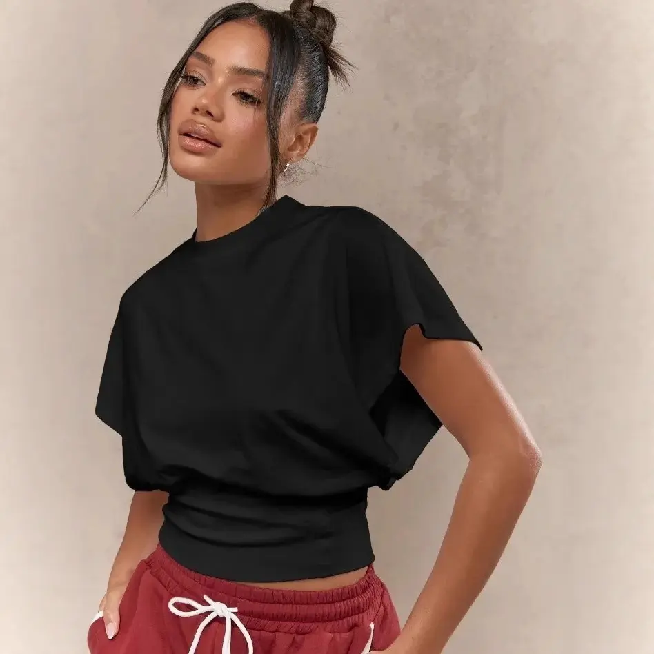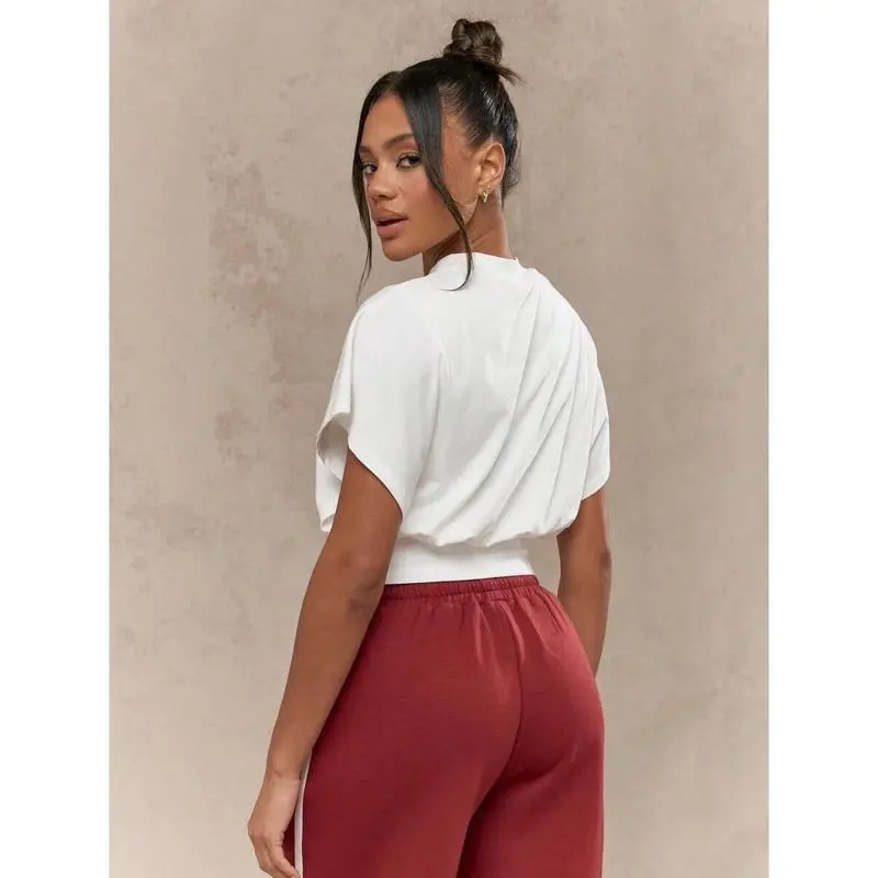 Hem Shaped:Tight Hem/Festivals:Back-to-School/Lined For Added Warmth:No/Pattern Type:Plain/Body:No/Sleeve Type:Batwing Sleeve/Color:White/Details:Ruched/Style:Casual/Neckline:Round Neck/Sleeve length: cap sleeve/Length:Crop/Fit Type:Loose/Fabric Elasticity:Medium Stretch/Material:Knitted Fabric/Composition:62% Polyester, 34% Cotton, 4% Elastane/Care Instructions:Machine wash or professional dry clean/Sheer:No