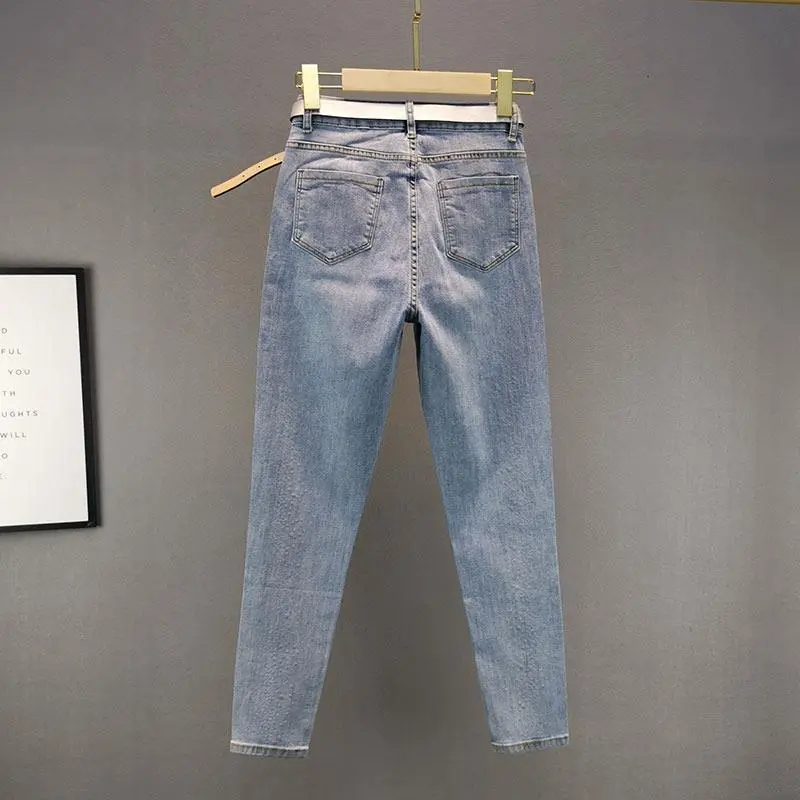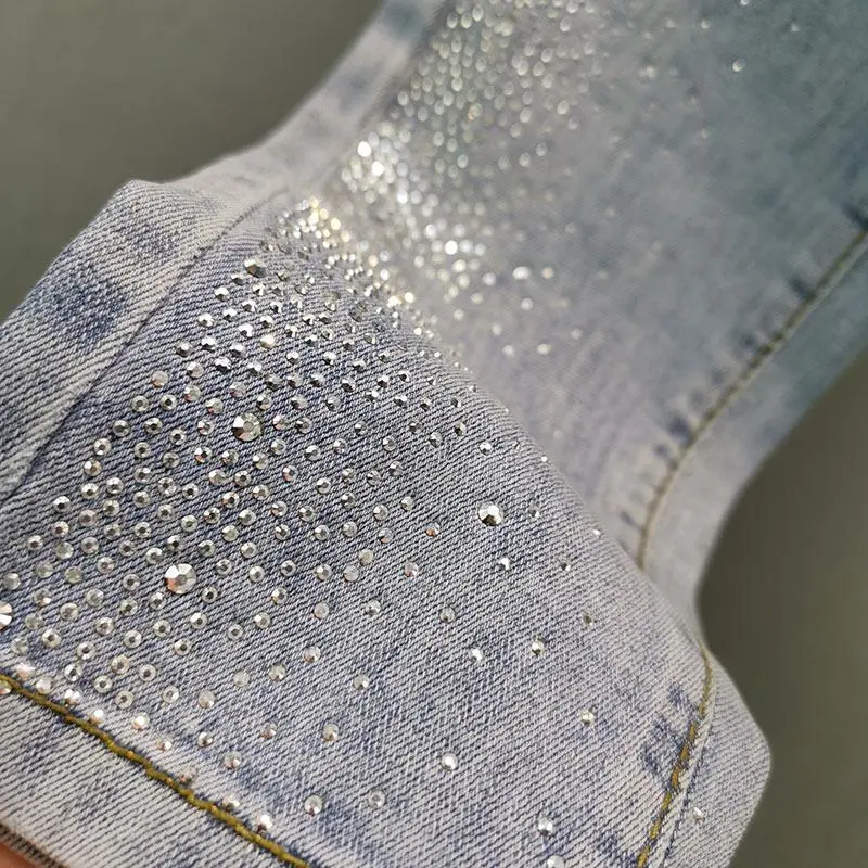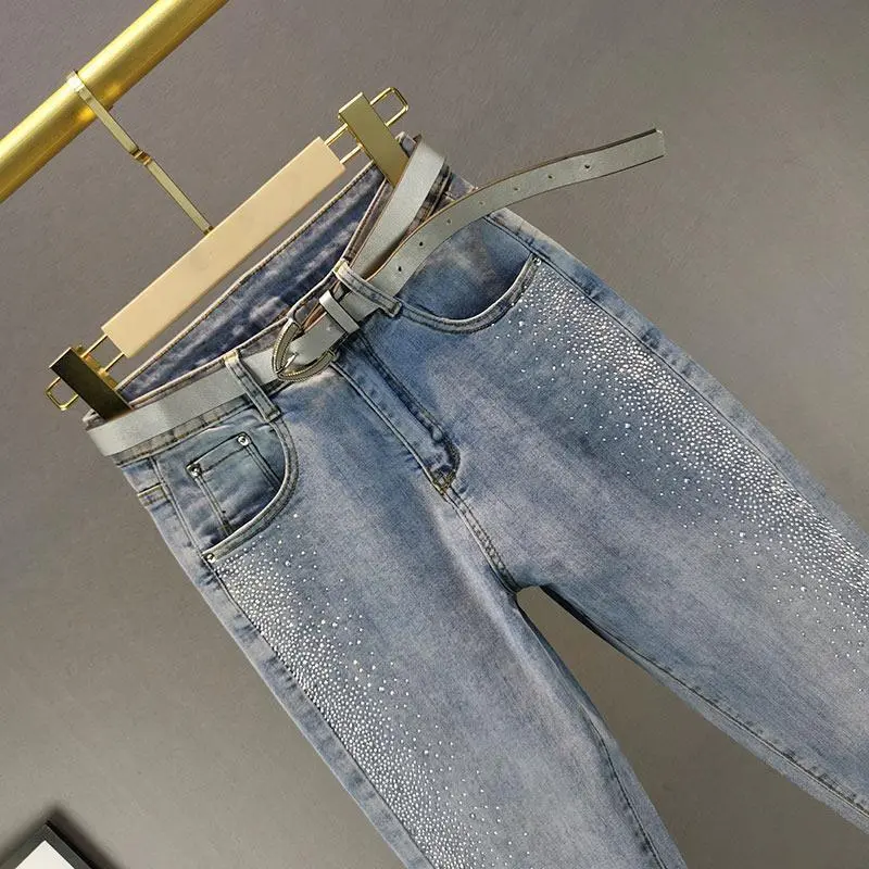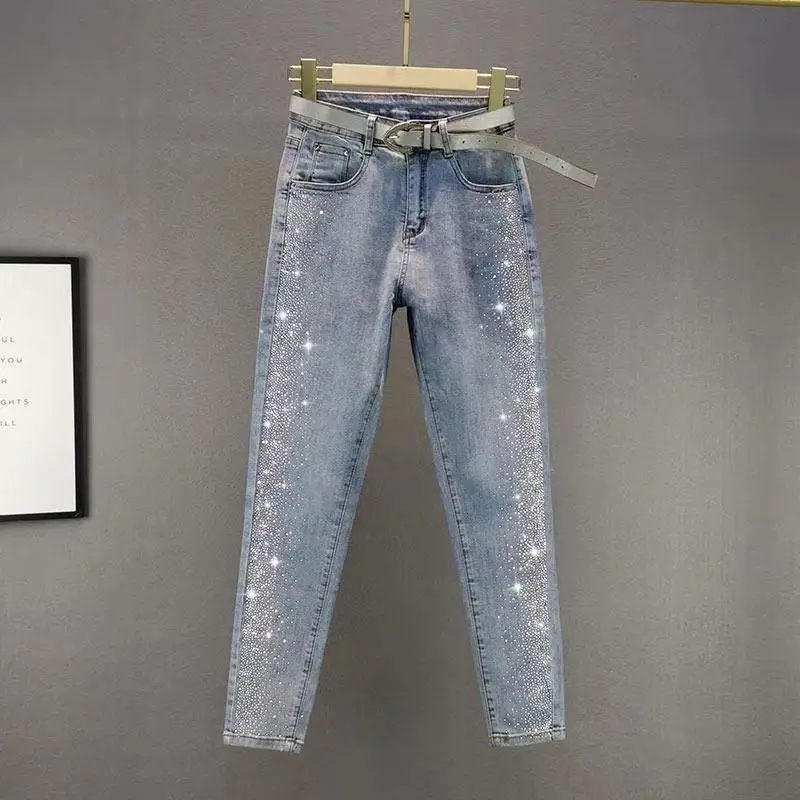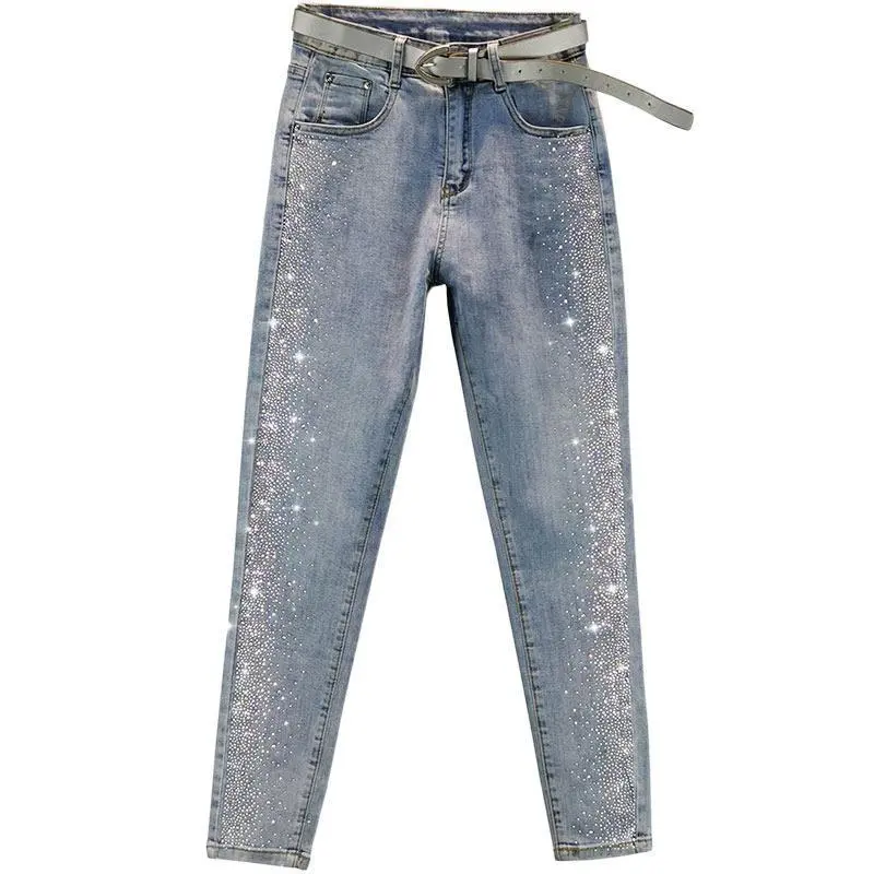 European Style Rhinestone Jeans for Women Trendy 2025 Autumn Cotton Stretch Slim Fit High Waist Ankle-Length Skinny Pants