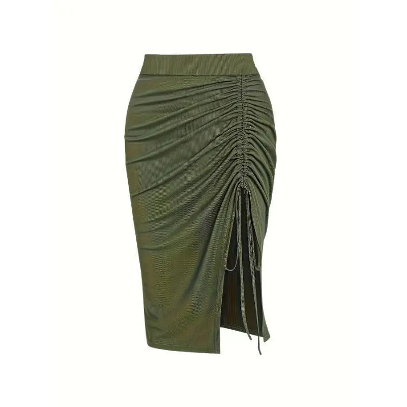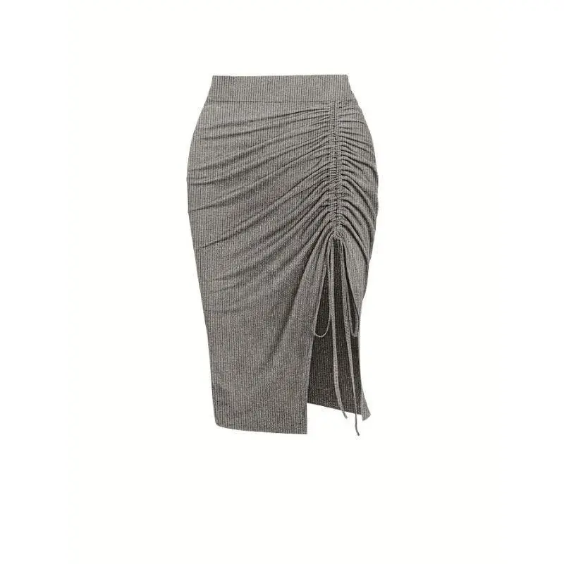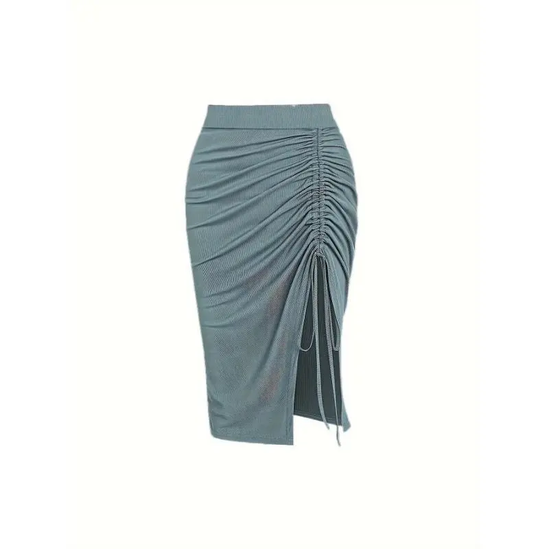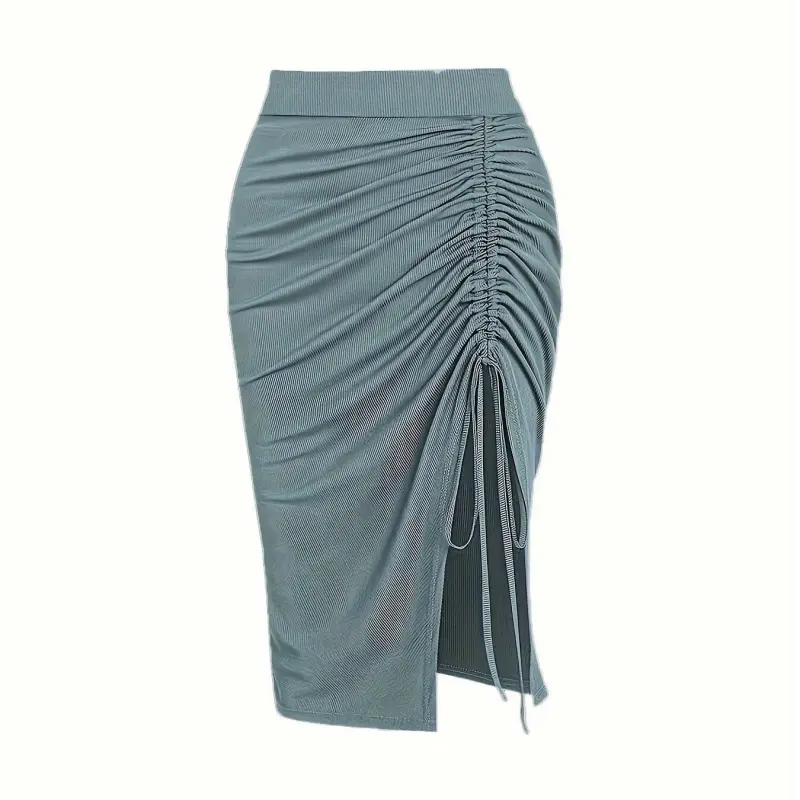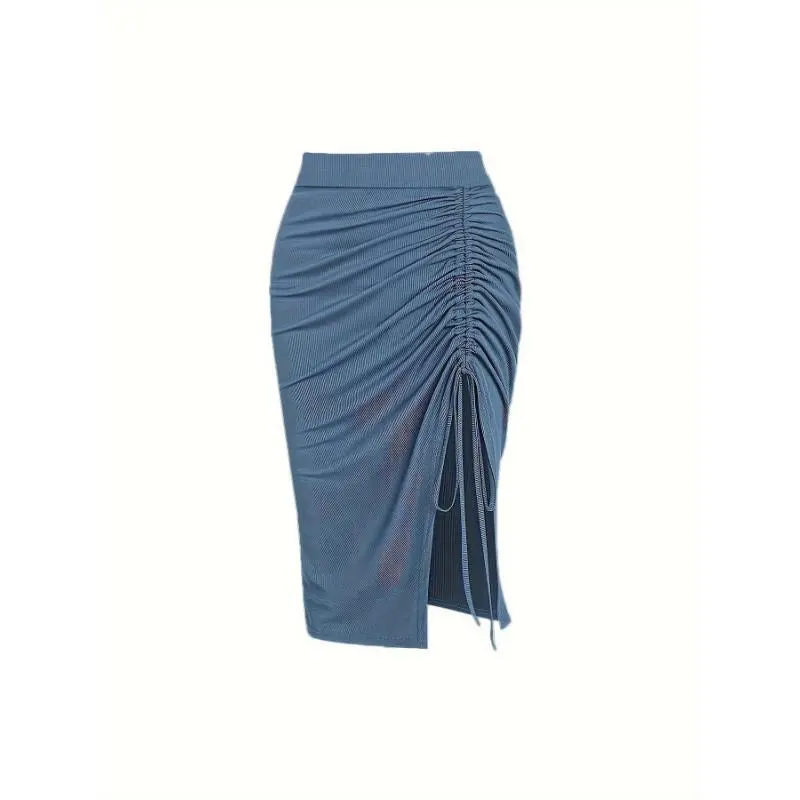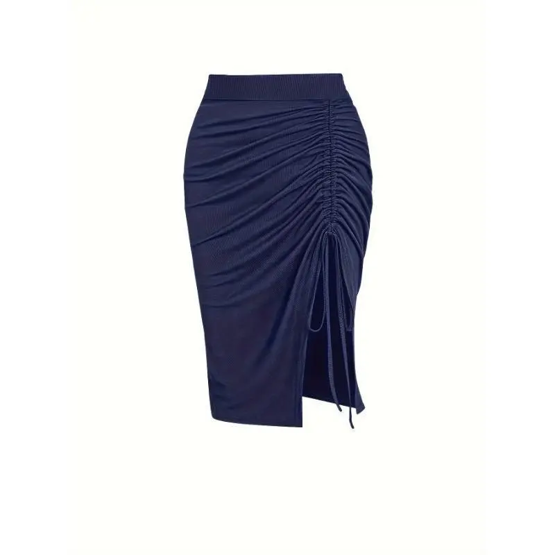 Elegant Dark Blue Midi Skirt with Sexy Drawstring Ruched Detail - High-Waisted, Asymmetrical Hem, Stretchy Polyester Blend, Machine Washable - Perfect for Summer Fit Fabric Womenswear Bottom