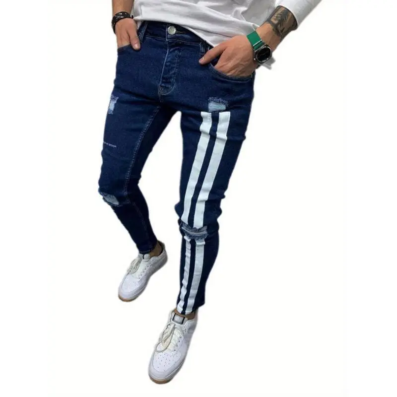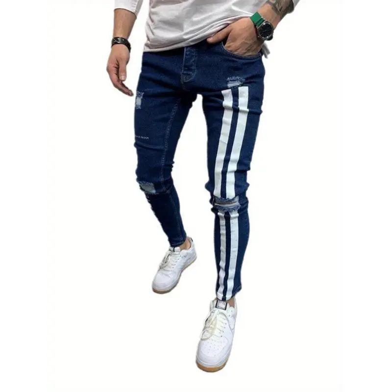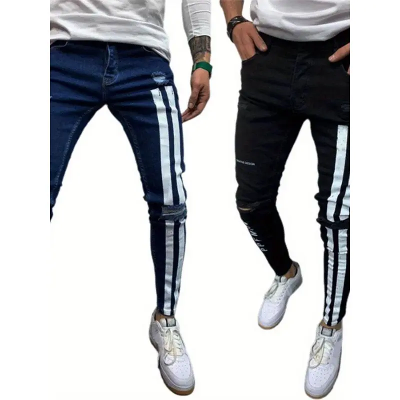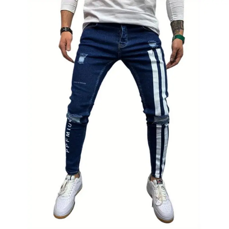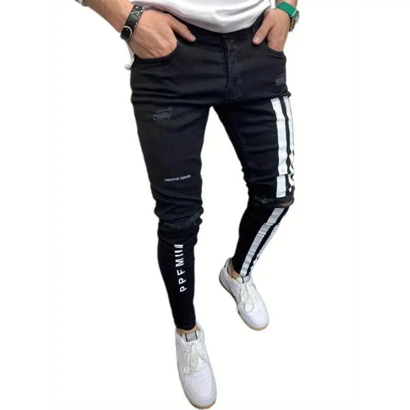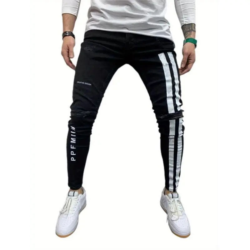 Men'S Denim Long Pants, Striped Letter Distressed Destroyed Ripped Zip Slim Jeans, Wild Fashion Pull-Up Trousers