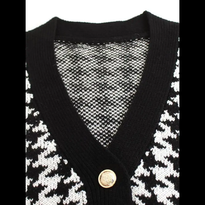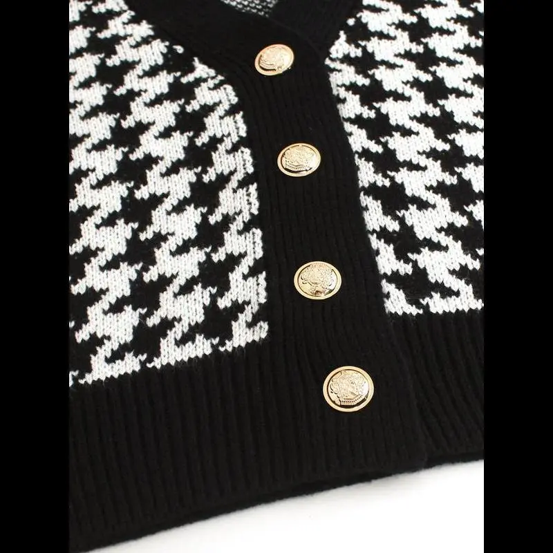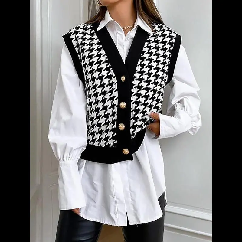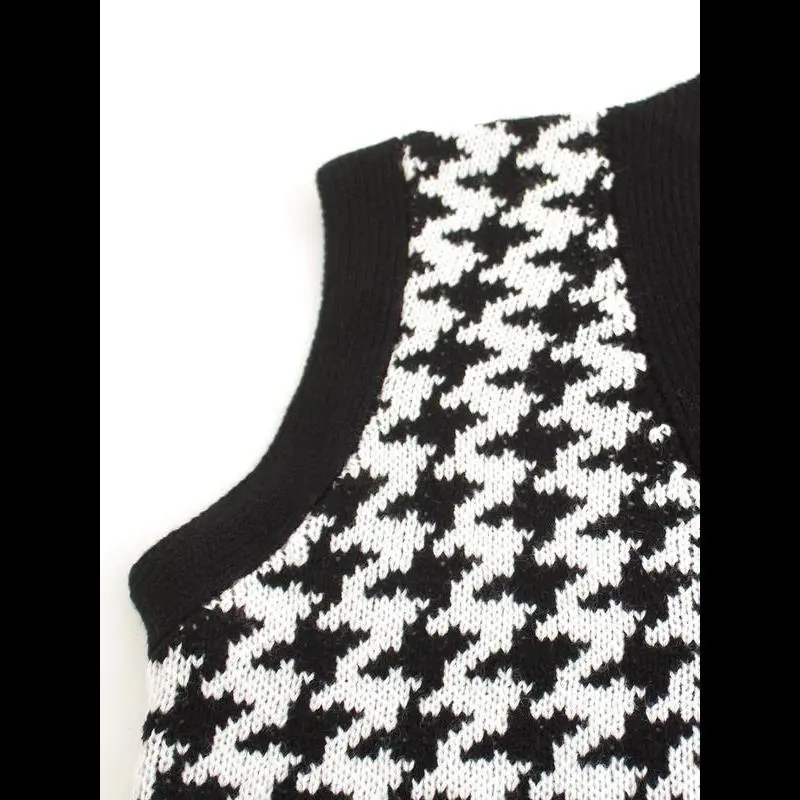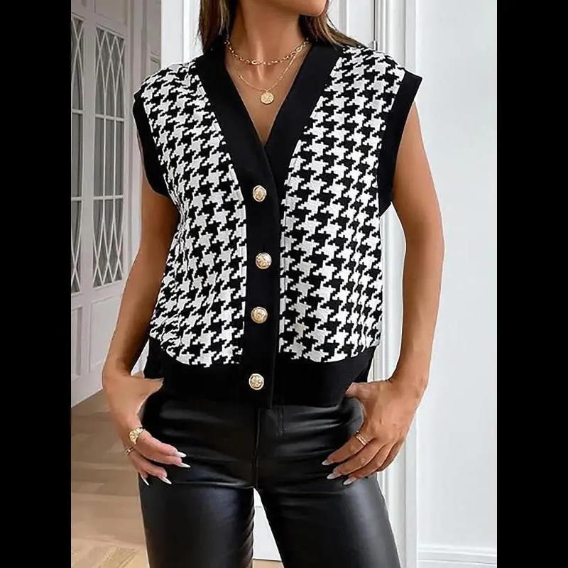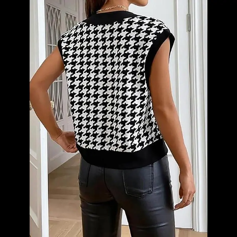 [Houndstooth Pattern]: Features a distinctive houndstooth pattern, giving a unique visual appeal that sets it apart from conventional knitwear./[Button Closure]: Equipped with a button closure at the V-neck, allowing for easy wear and adding a touch of sophistication./[Sleeveless Design]: The sleeveless style provides a breathable option for warmer weather, making it perfect for transitional seasons./[Fitted Silhouette]: Offers a fitted cut that accentuates the body shape, ensuring a flattering fit for various body types./[Knit Fabric]: Made from quality knit fabric, providing an enjoyable texture and durability, perfect for everyday wear.