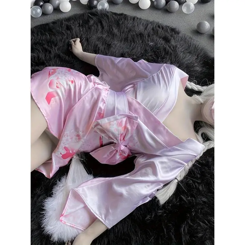 New Sensual Pink Floral Dream Kimono Set with Obi and Trousers - Sexy Japanese Style Outfit for Dates Lace Womenswear Gowns Loungewear