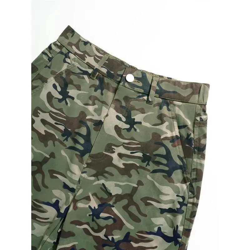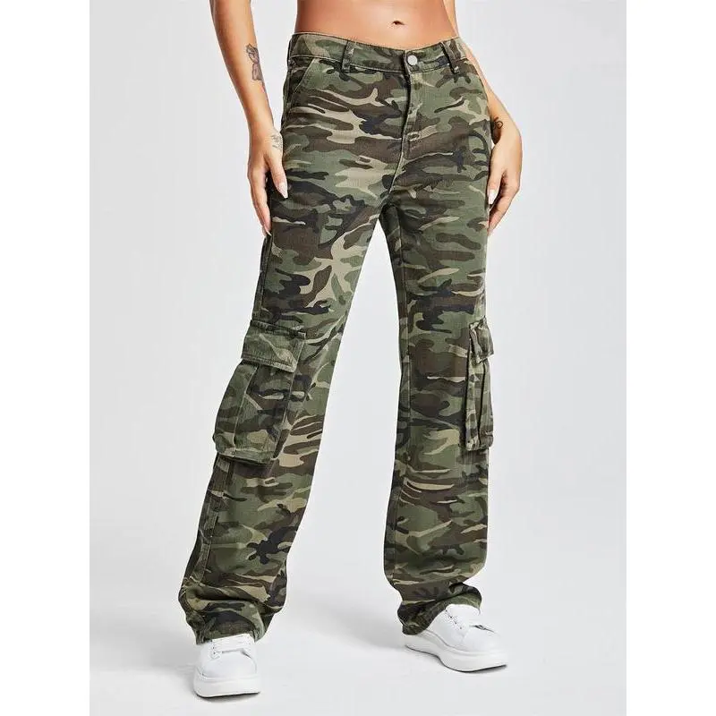 Women's Camo Print Pocket Cargo Pants, Casual Street Button Straight Leg Trousers for Daily Wear, Ladies Bottoms for All Seasons