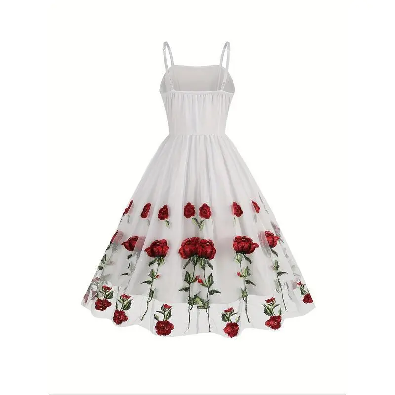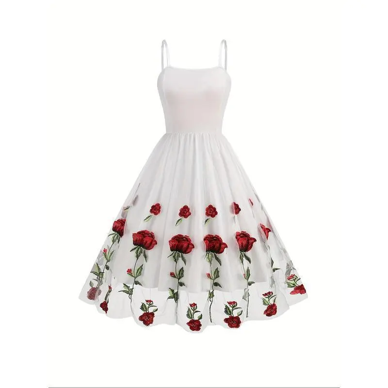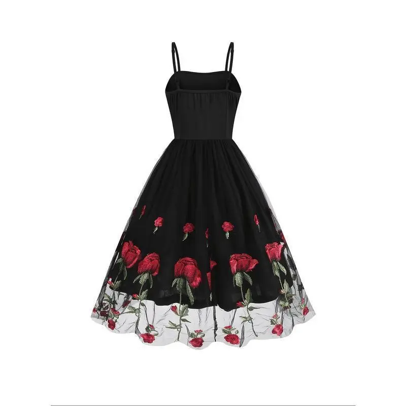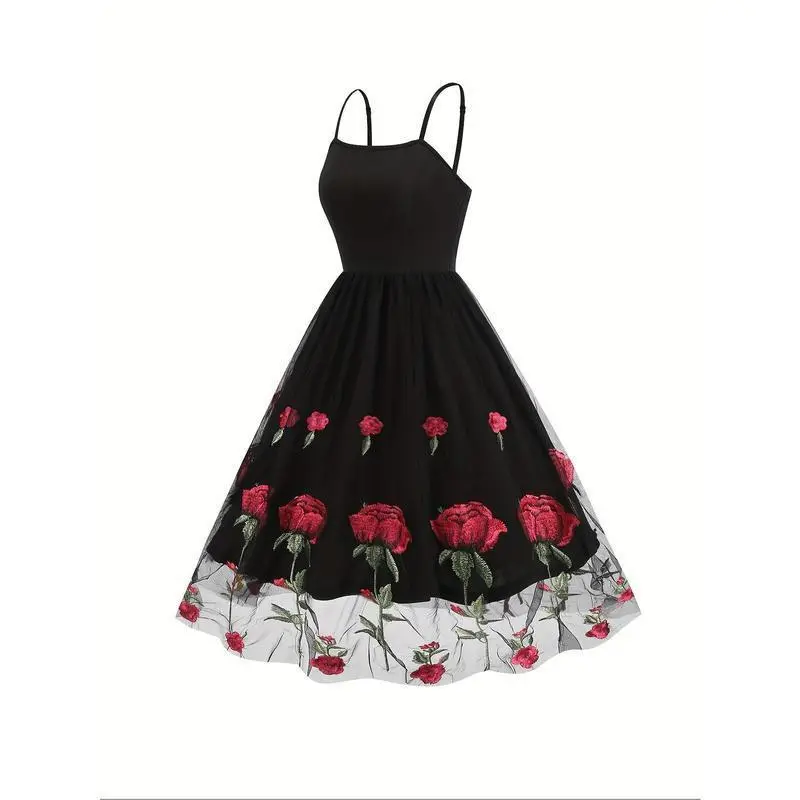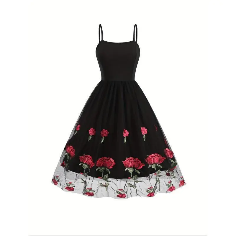 Elegant Vintage-Style Women's Valentine's Day Dress - Black with Red Rose Embroidery, White Lace Trim, Polyester Knit Cami with Mesh Overlay, Machine Washable Casual Womenswear Spaghetti Summer