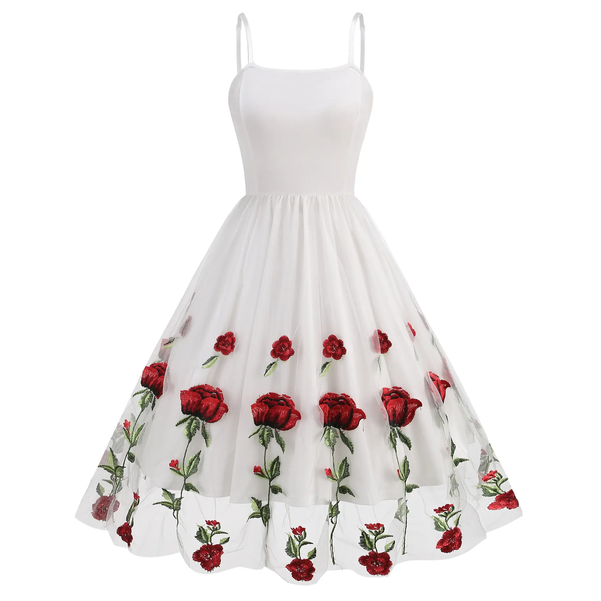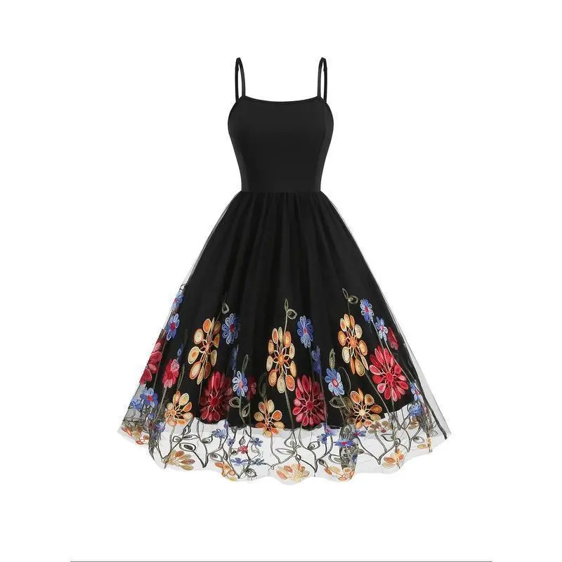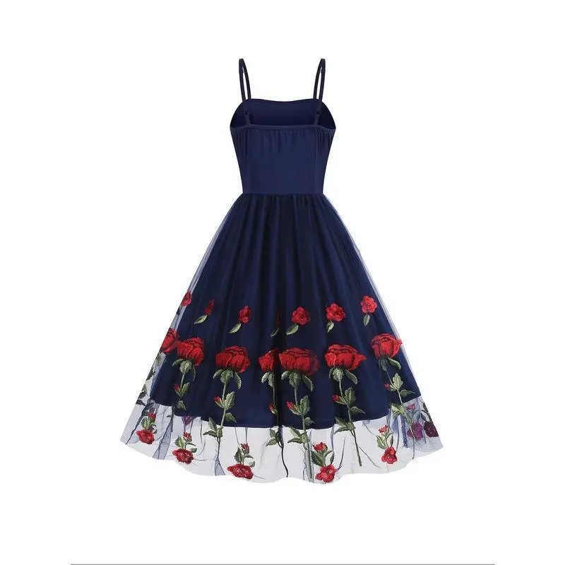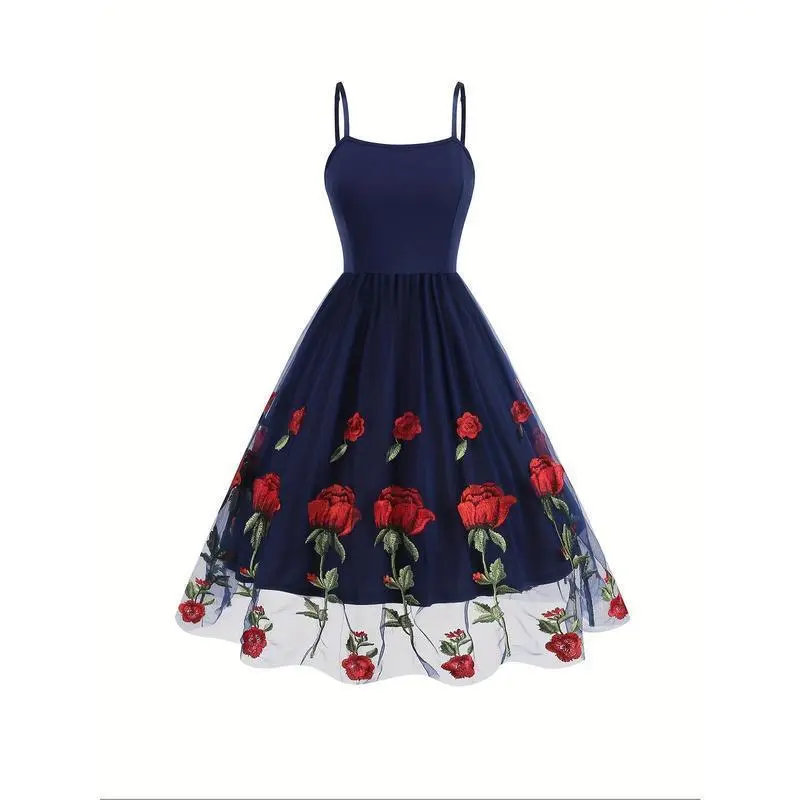 Elegant Vintage-Style Women's Valentine's Day Dress - Black with Red Rose Embroidery, White Lace Trim, Polyester Knit Cami with Mesh Overlay, Machine Washable Casual Womenswear Spaghetti Summer