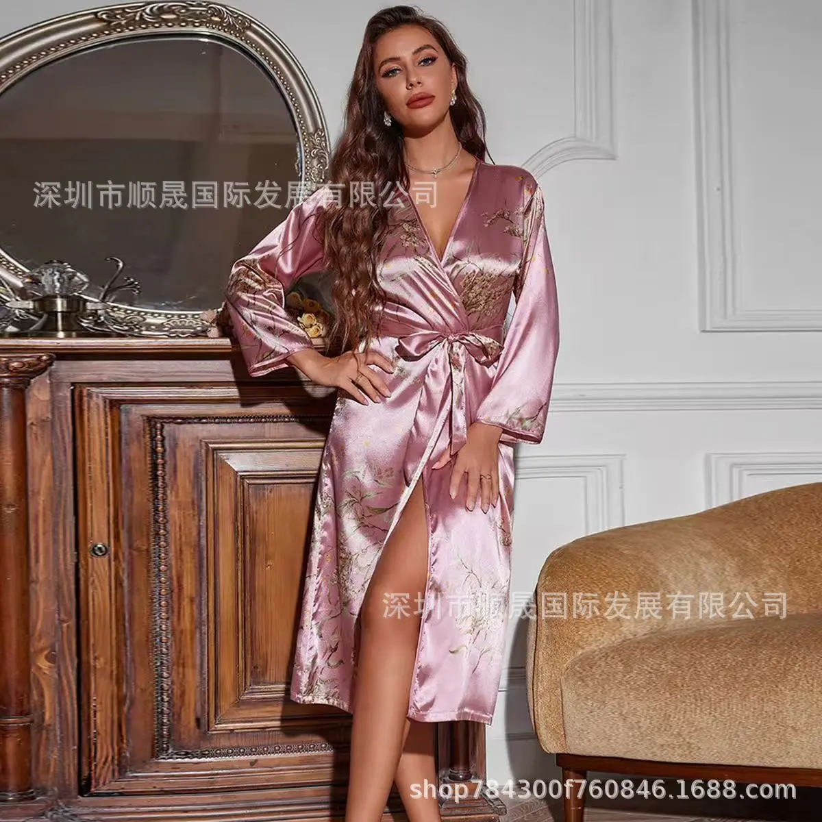 Faux Silky Tie Bathrobe - Cherry Blossom Print, Software, Autumn Winter Wear Fabric Women enswear