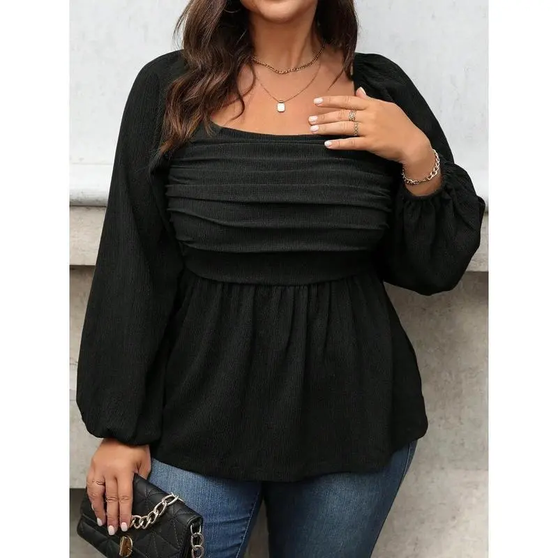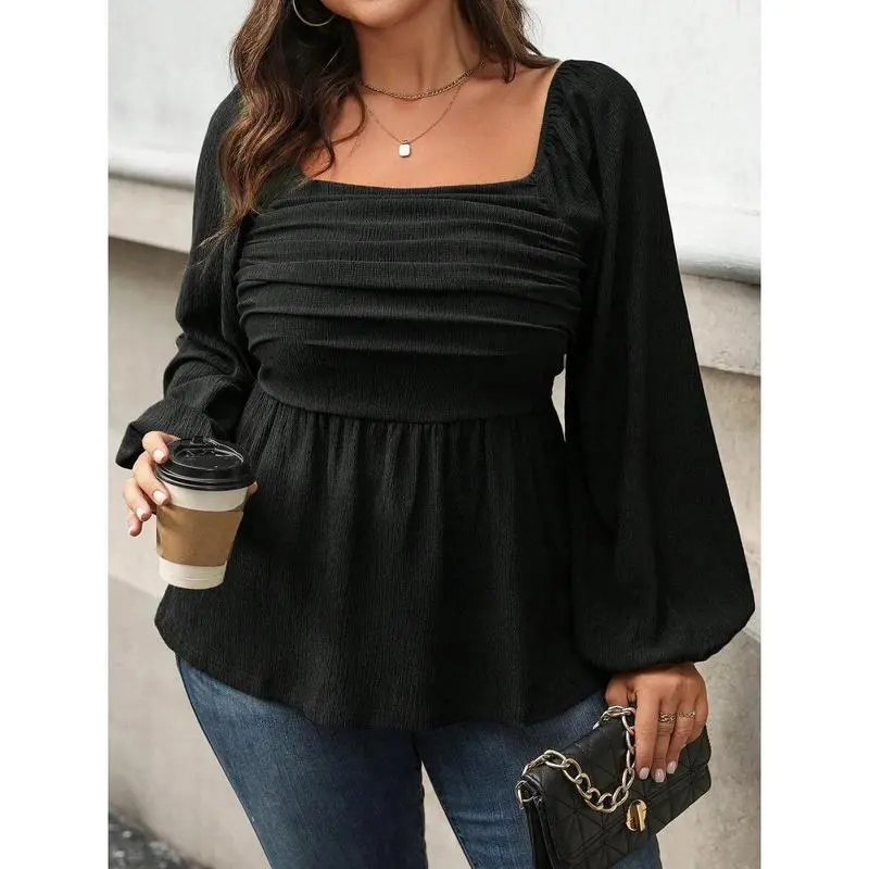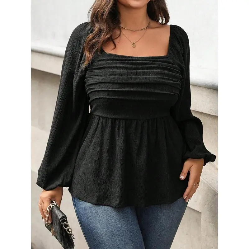 Plus Size Solid Color Square Collar Ruffle Hem Long Sleeve Blouse Peplum Top