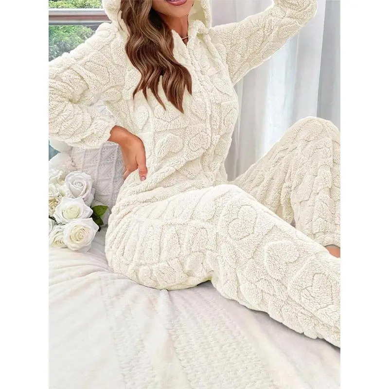 Women's Heart Jacquard Zip Up Hooded Sleep Jumpsuit, Casual Long Sleeve Jumpsuit for Fall & Winter, Women's Sleepwear for Indoor Wear