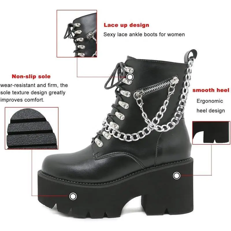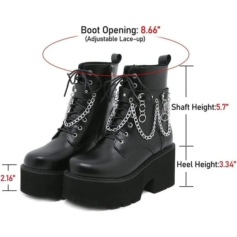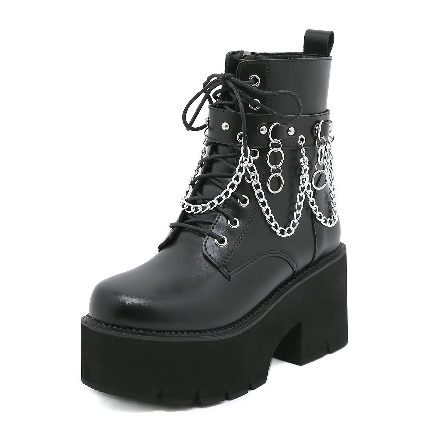 Fashion Chunky Heel Platform Combat Ankle Booties Women's Chains Lace up Studded Motorcycle Combat Short Boots Round Toe Side Zipper Black Gothic Boots