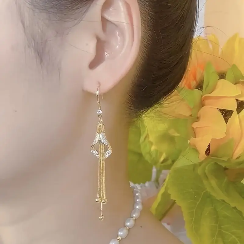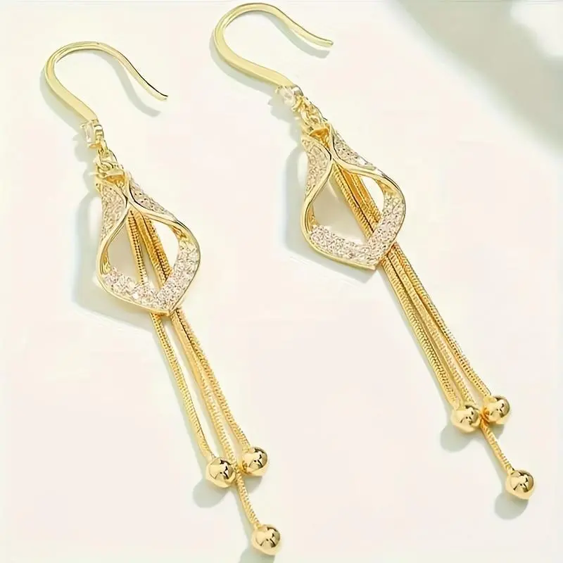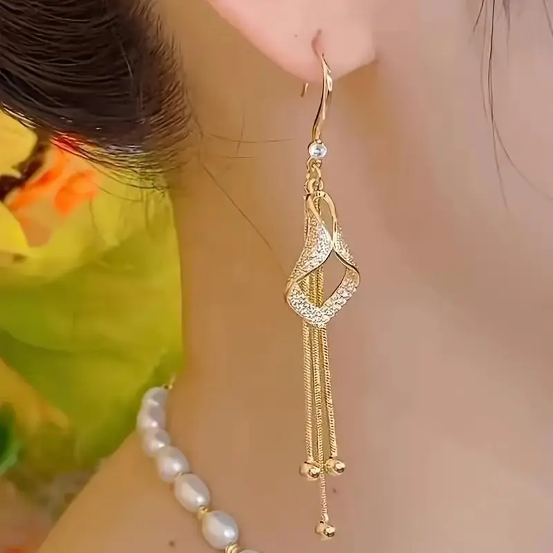 Elegant14KGolden-PlatedRhinestoneTasselEarrings,ZincAlloyLongDangleEarringswithSyntheticDiamonds,CopperEarNeedle,forWomen,SuitableforAges14+