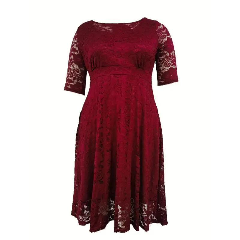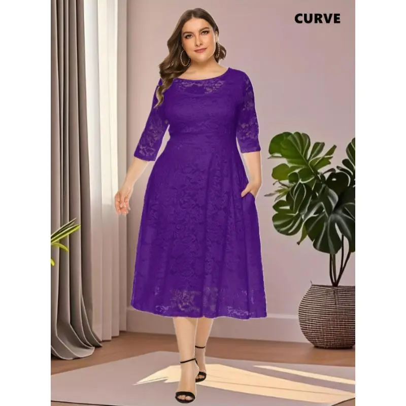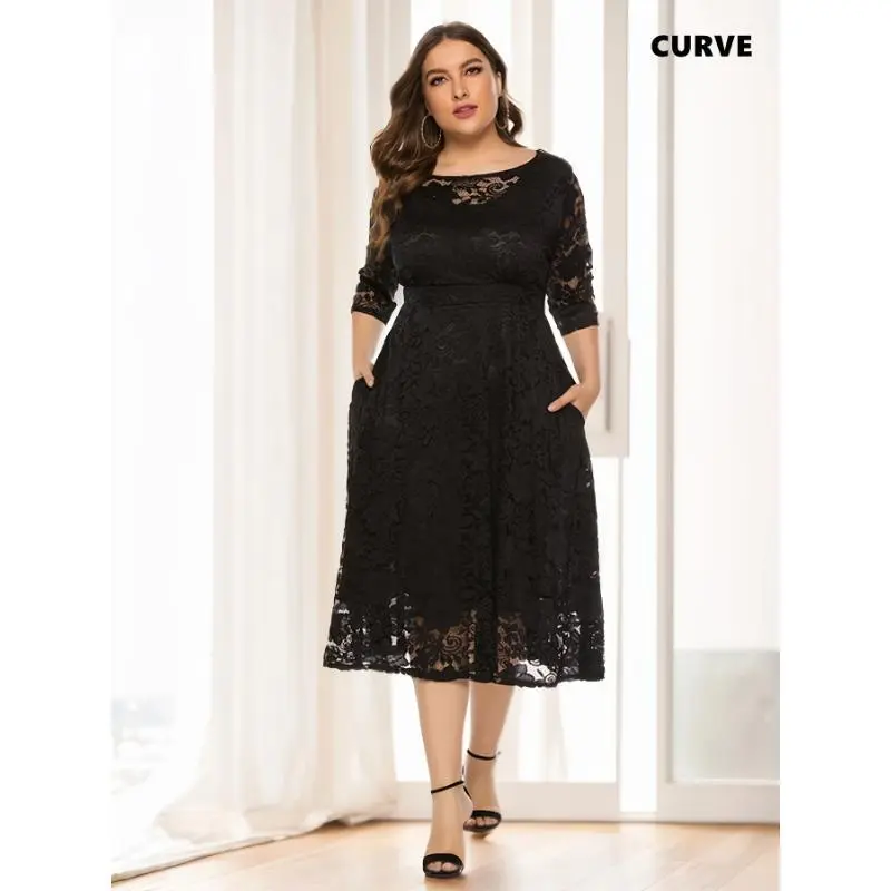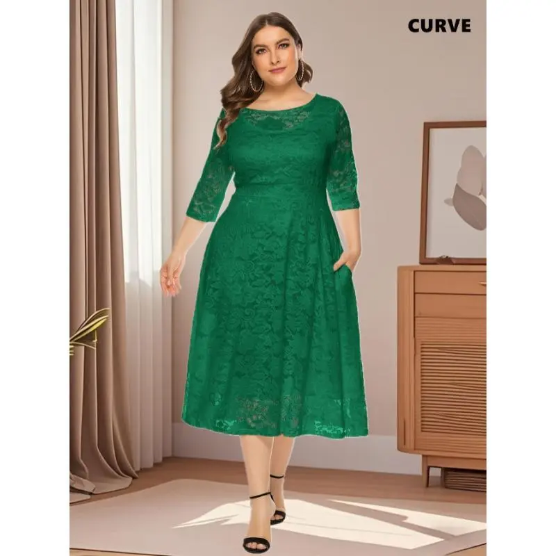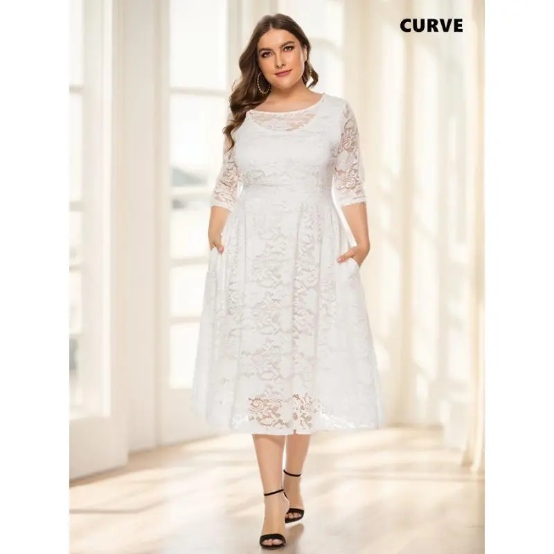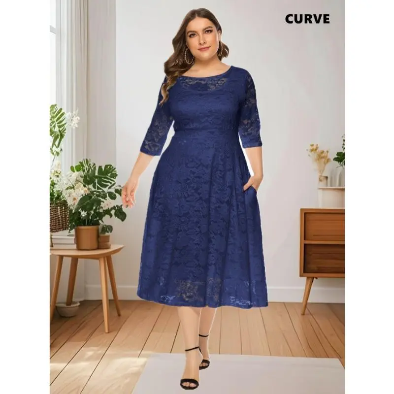Material:Lace Occasion:Wedding Season:Spring/Summer/Fall Type:Fitted Placket Type:Pullovers Dresses Length:Midi Sheer:No Hem Shaped:Trapeze Fit Type:A Style:Elegant Operation Instruction:Machine wash, do not dry clean Fabric:Slight Stretch Silhouette:Big-tall Suitable types:Regular Fit Pattern:Solid color Details:Pocket Chest Pad:No Padding Sleeve Type:Regular Sleeve Sleeve Length:Three Quarter Length Sleeve Belt:No Length:Midi Printing Type:No Printing Composition:92% Polyamide,8% Elastane Weaving Method:Knit Fabric Collar Style:Crew Neck Brand:Angelic Plus Lining Ingredients:100% Polyester Item ID:EN158573 Origin:Guangdong,China