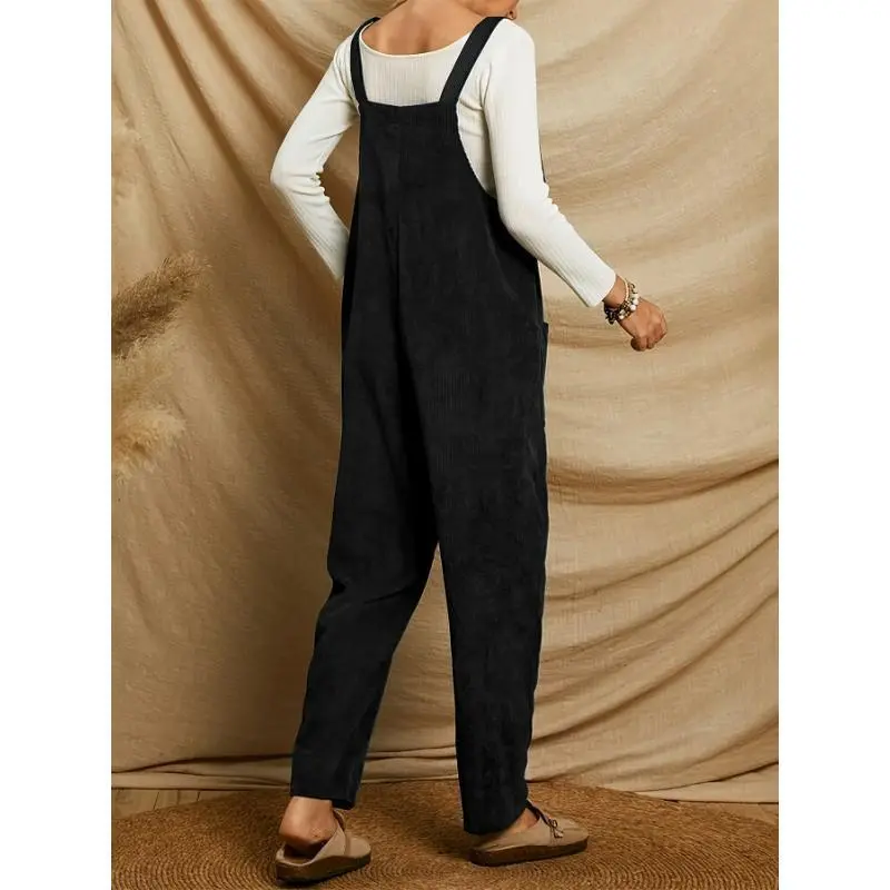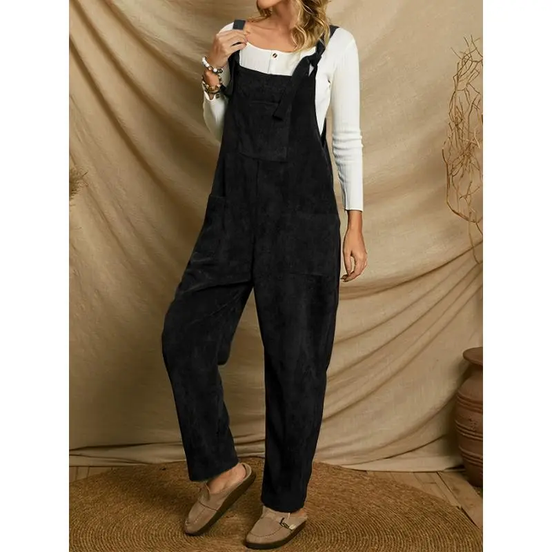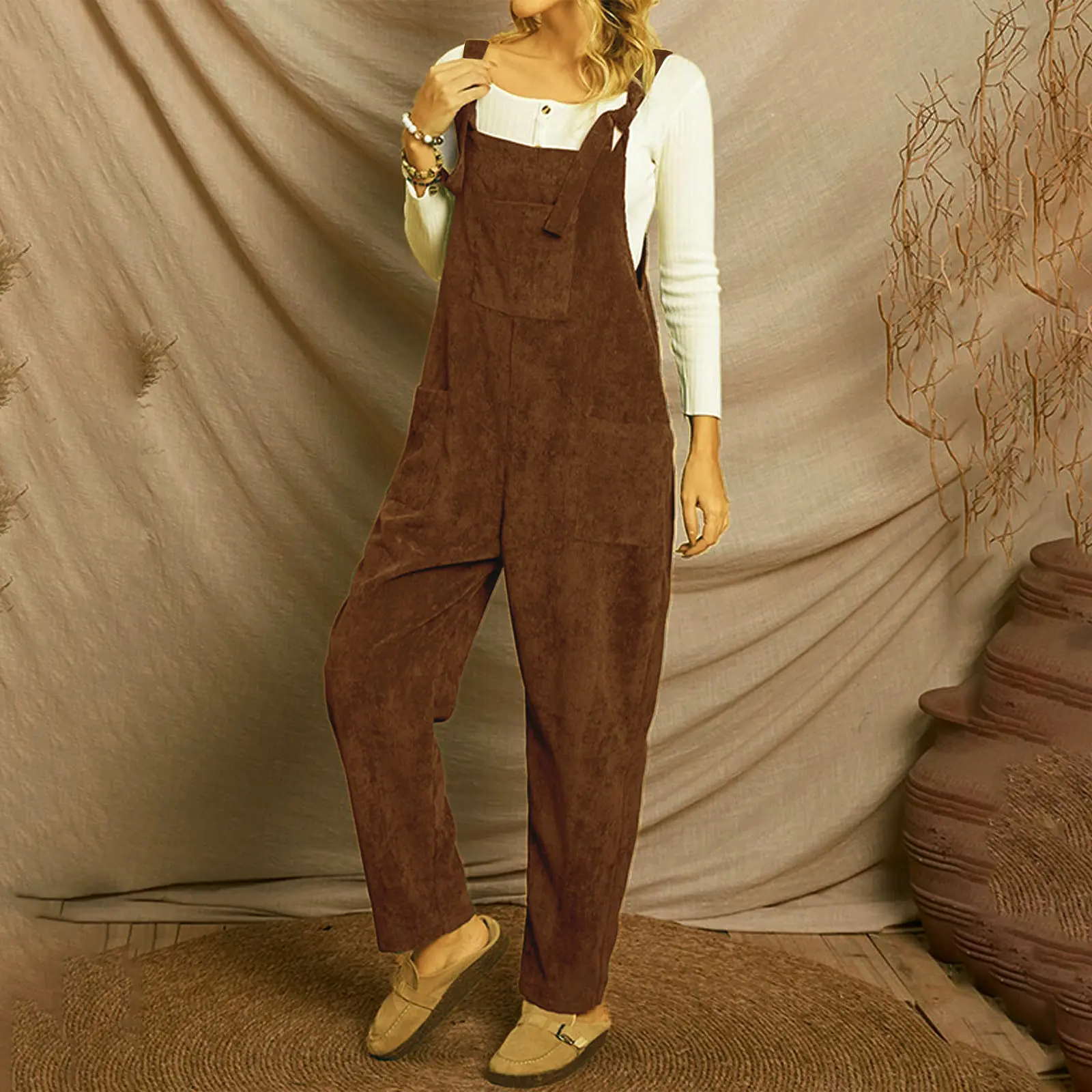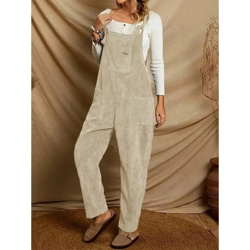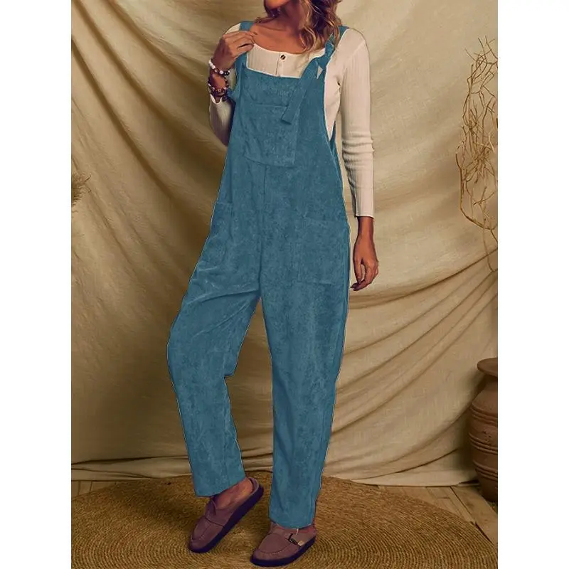 Spring and summer solid color corduroy women's casual jumpsuit with patch pockets, fitted retro cartoon beach theme color women's basic style