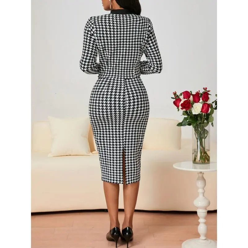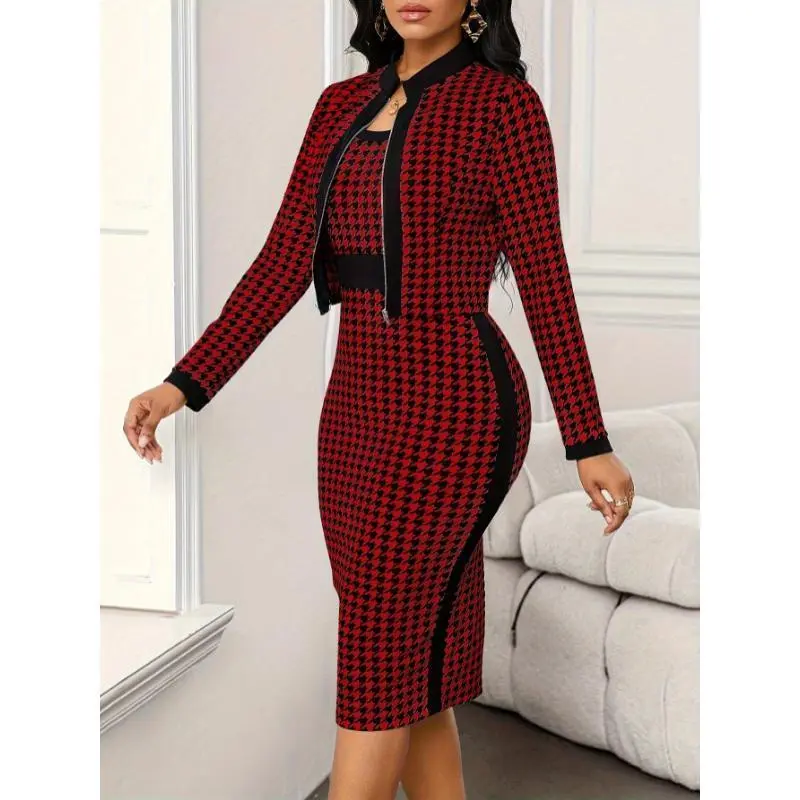 Elegant Houndstooth Two-Piece Set for Women - Casual Jacket & Bodycon Dress, Stretchy Polyester Blend, Machine Washable, Thousand Bird Pattern