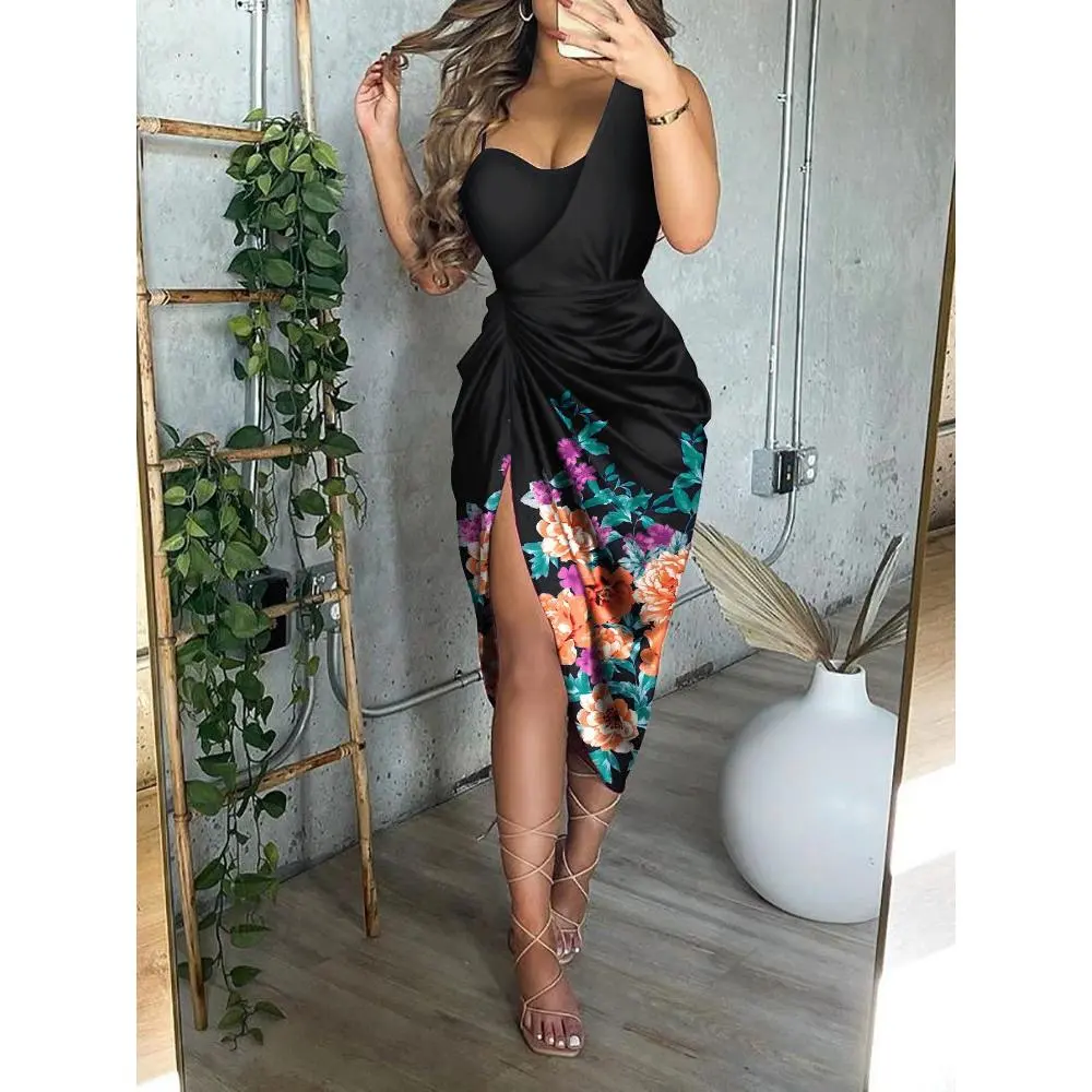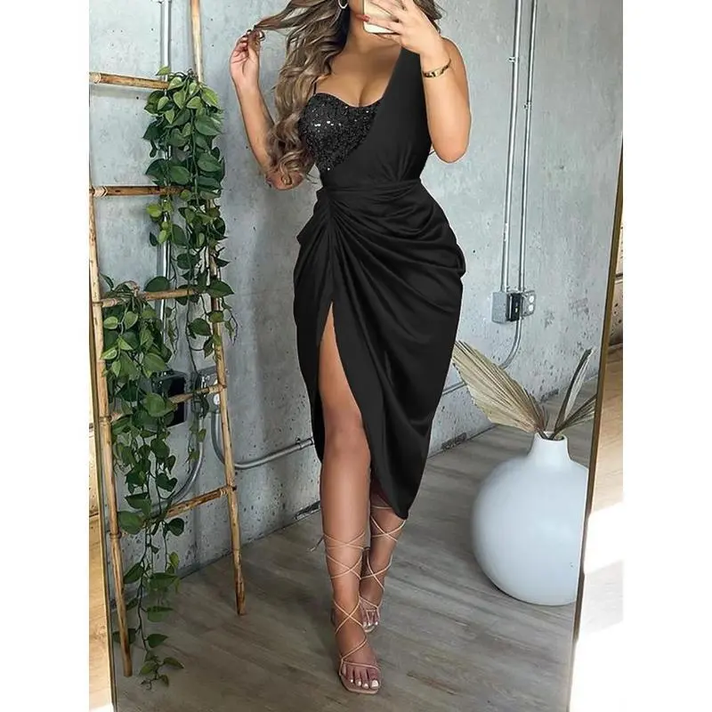 2025 New Solid Color Slit Long Skirt Ruched One Shoulder Elegant Dresses for Women Evening Formal Piece Suit