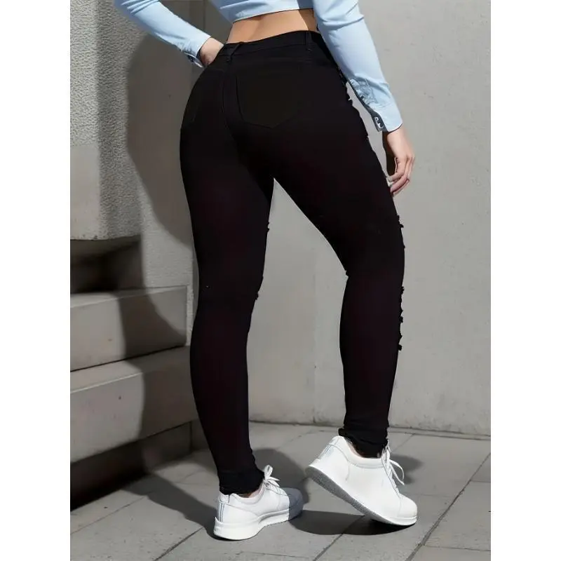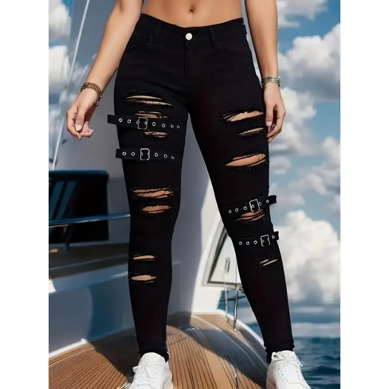 Women's High-Waist Black Skinny Jeans with Unique Buckle Detail - Stretch Denim, Distressed Look, Machine Washable - Perfect for Spring & Autumn Fashion, Plus Size Jeans Womenswear Bottom Streetwear Pants Trouser Fabric Slim
