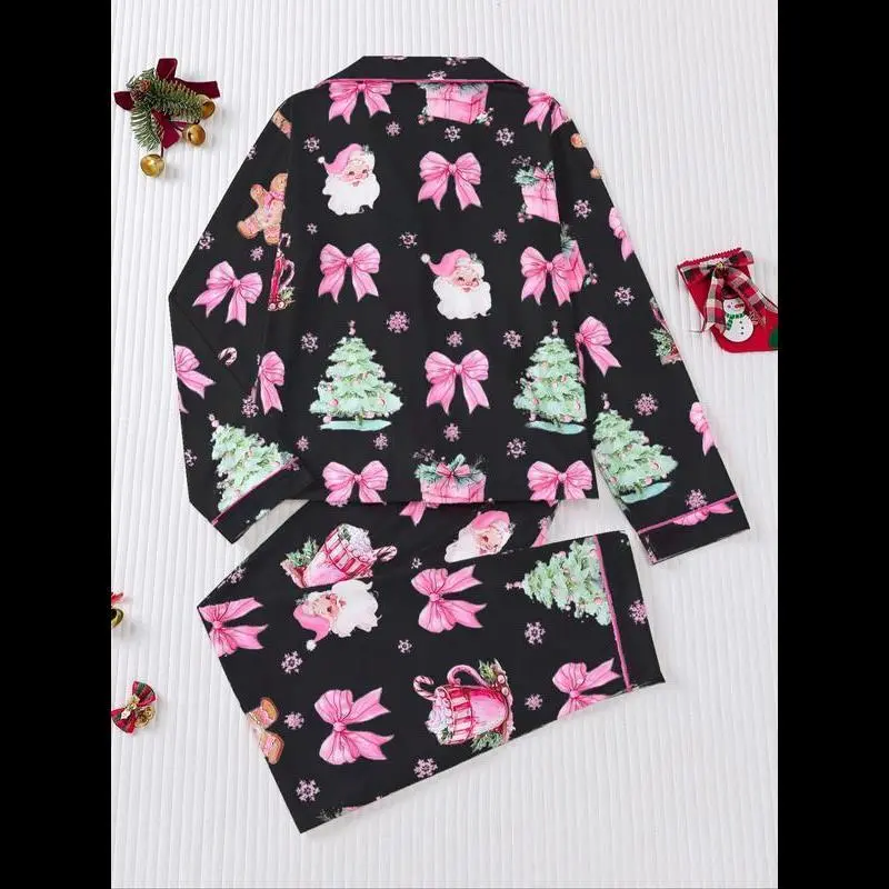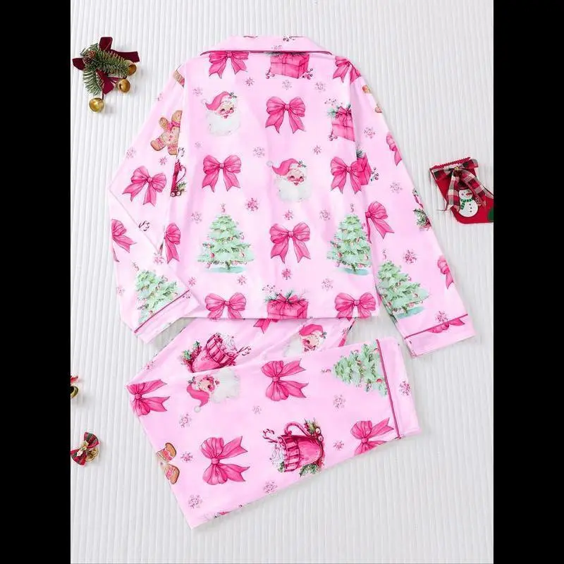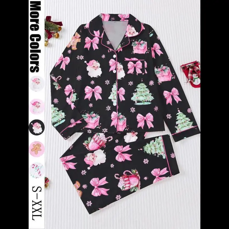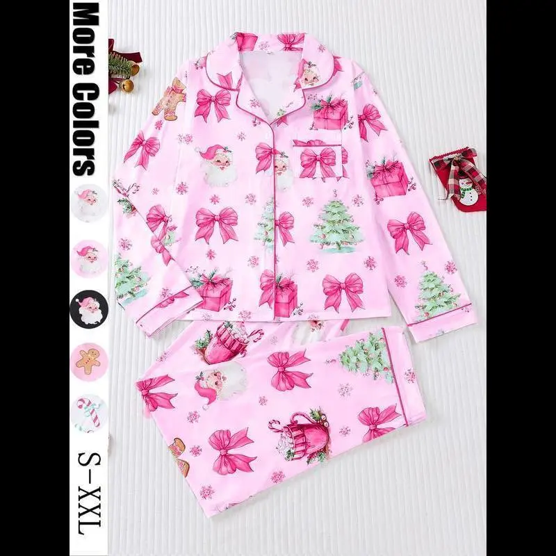 【Christmas】Women's Christmas Pajama Set, Long Sleeve Lapel Top & Elastic Pants, Casual Fitted Comfortable Sleepwear for Fall Winter Holidays,Christmas Pyjamas Loungewear Womenswear