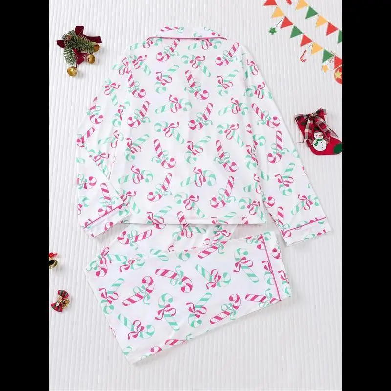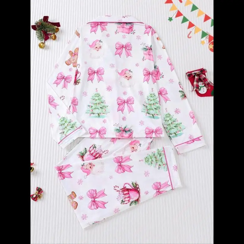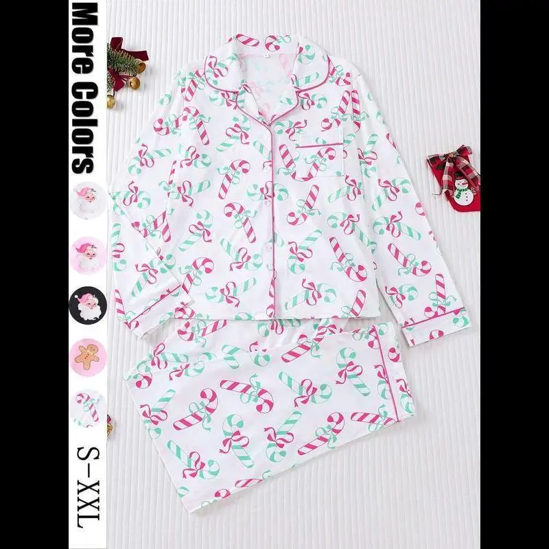 【Festive Print】: Features an all-over Christmas print with Santa, cookies, and candy, making it ideal for holiday celebrations./【Seasonal Fabric】: Crafted from moderate thickness knit fabric, providing warmth and coziness perfect for fall and winter wear./【Relaxed Fit】: Includes a comfortable collar and elastic wide-leg pants, allowing for easy movement during leisure time at home./【Holiday Theme】: Themed sleepwear that doubles as party attire, merging functionality with fun aesthetics for festive gatherings./【Two-Piece Set】: Comprises a long-sleeve top and matching pants, offering a coordinated look for relaxed days at home.