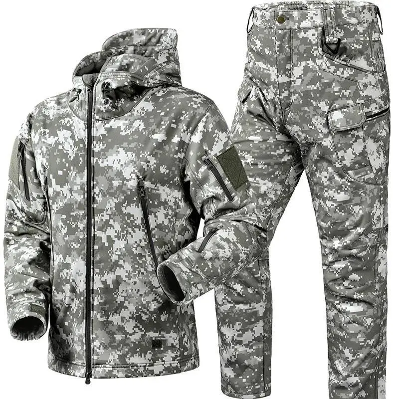 Winter Thicken Men Camo Suit Waterproof Tactical Training Set Multi-pocket Hooded Jacket Fleece Pants Outdoor Hunting 2-piece