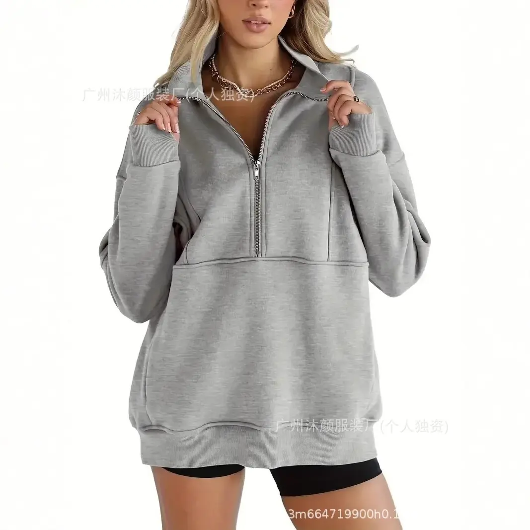 Women'S Half Zip Sweatshirts Fleece Stand Collar Long Sleeve Thumb Hole Oversized Pullovers With Pockets