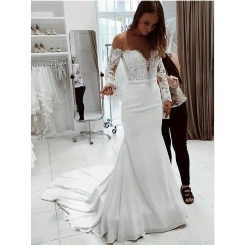 Elegant Off-the-Shoulder Lace Long Sleeve Mermaid Fishtail Wedding Dress - Floor-Length Bridal Gown with Keyhole Neckline,