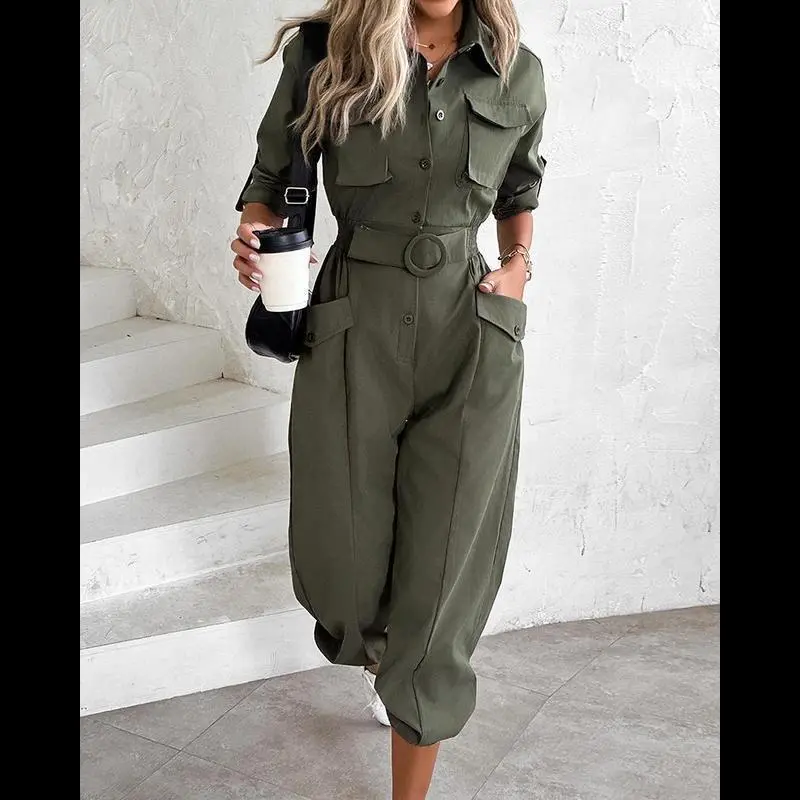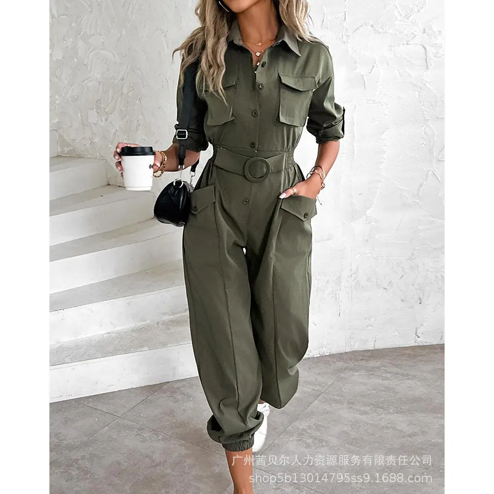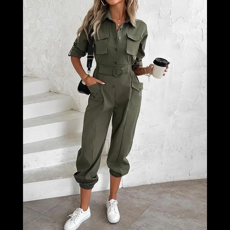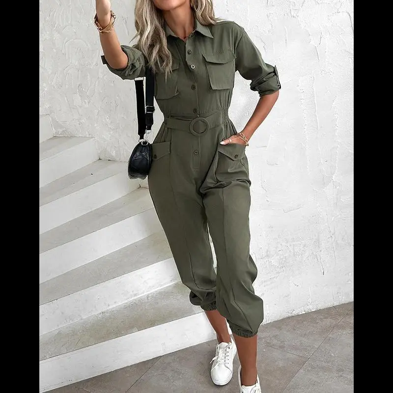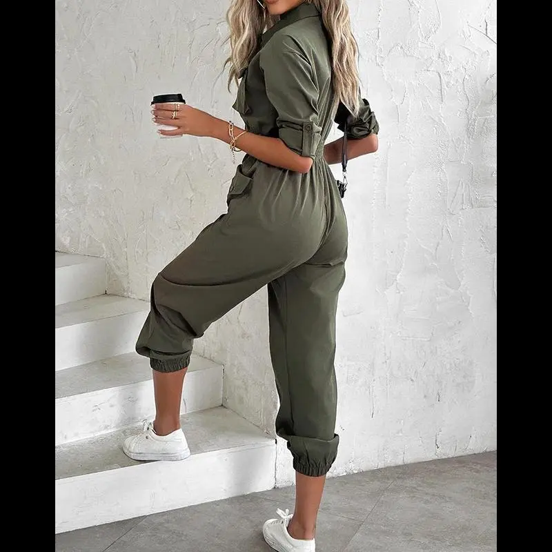 About this Item/Roll-Up Sleeves: The adjustable roll-up sleeves add versatility, allowing you to customize the style and comfort based on the occasion./Shirred Waist Design: The shirred waistline ensures a comfortable, flexible fit that flatters your figure and enhances your silhouette./Utility Pocket Design: Multiple spacious pockets add a practical and stylish touch, perfect for carrying small essentials./Functional and Versatile: Ideal for both casual wear and outdoor activities, combining style with practicality./Product Details/Style: Chic/Type: Jumpsuit/Material: 97% Polyester,3% Elastane/Neckline: Turn-down Collar/Package Include: 1*Jumpsuit/Size Guide (Body Measurements for Reference)