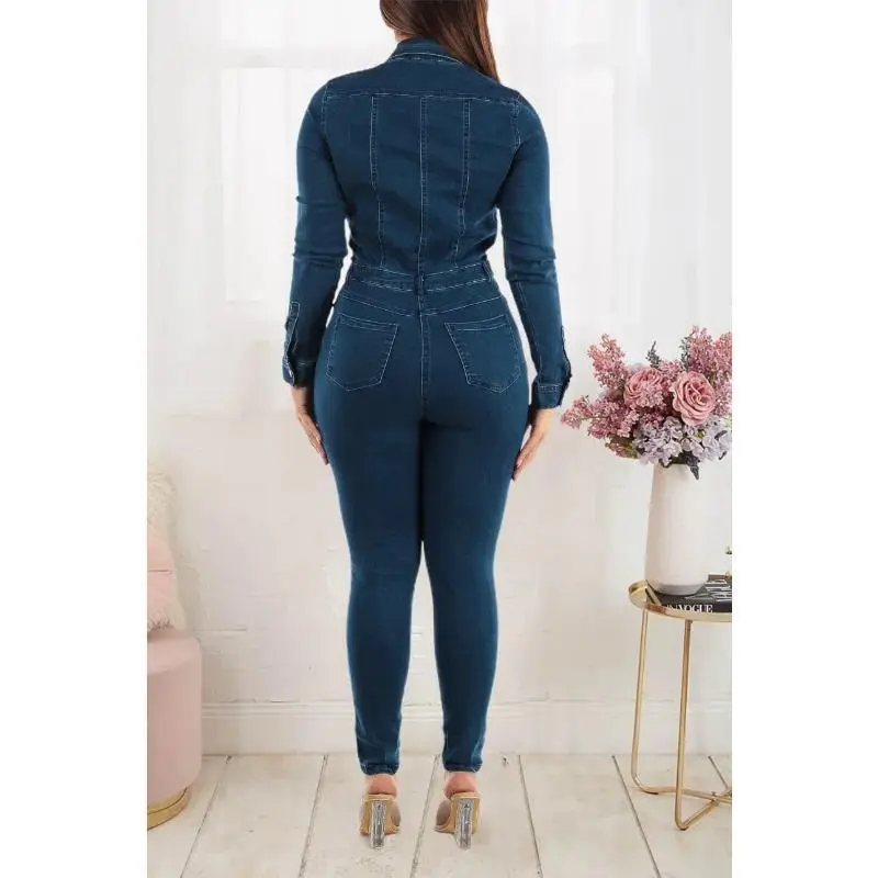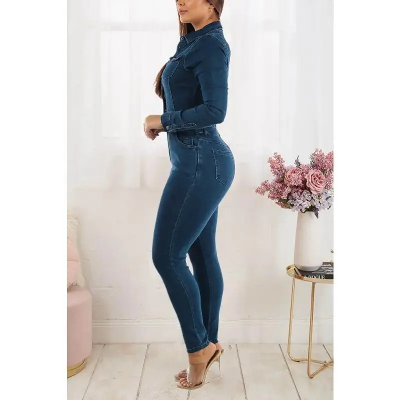 Jumpsuit sports suit Turn Down Collar Women One Piece Full Sleeve Tight High Waist Overalls Slim Denim Jumpsuits Sheath Long Pants Rompers Autumn