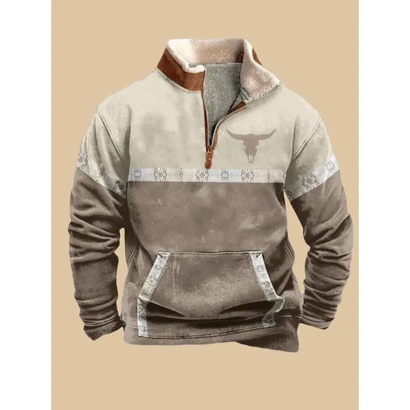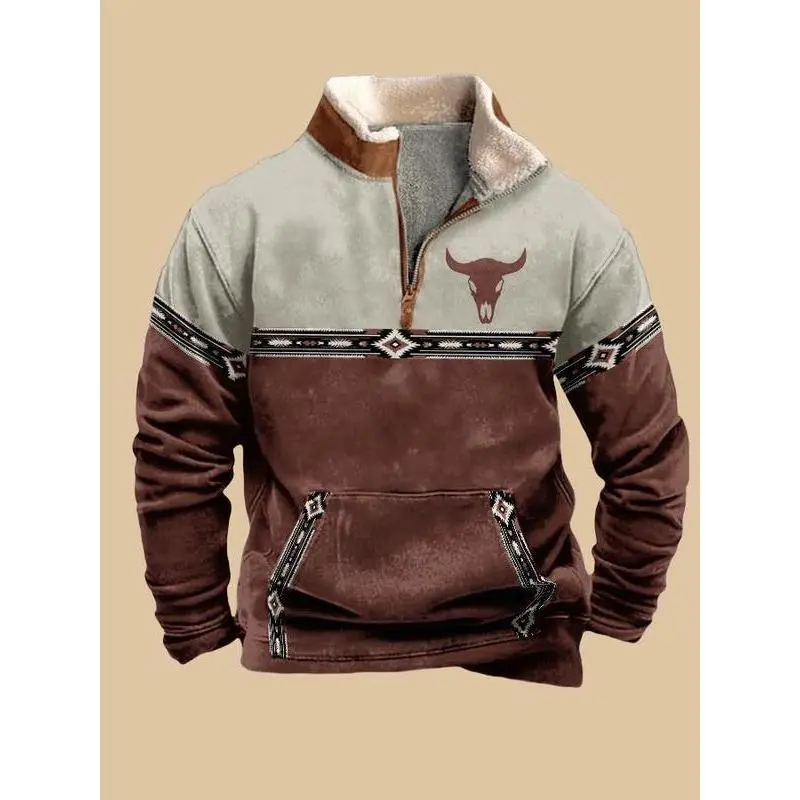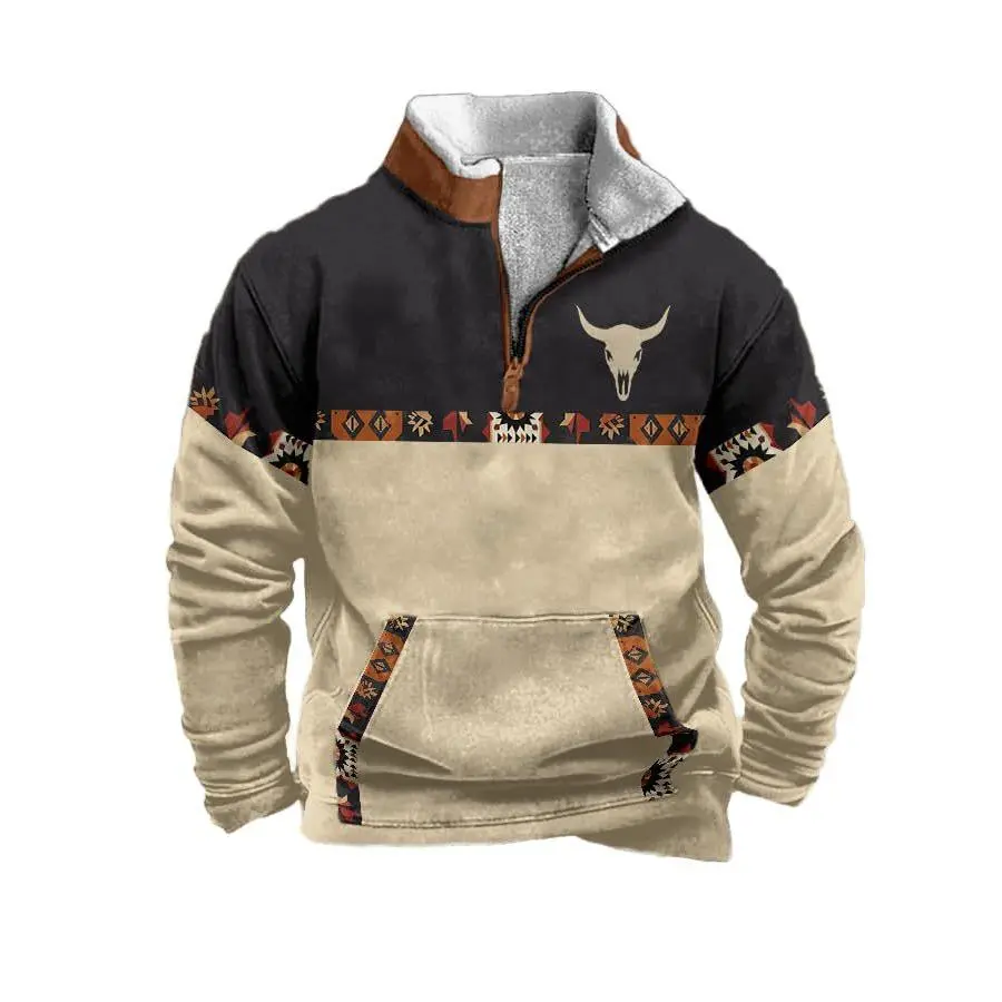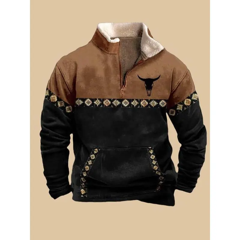 Men’s Western Fleece Hoodie – Aztec Fuzzy Pullover, Vintage Cowboy Style Half-Zip Sweater with Stand Collar & Pockets, Winter Streetwear