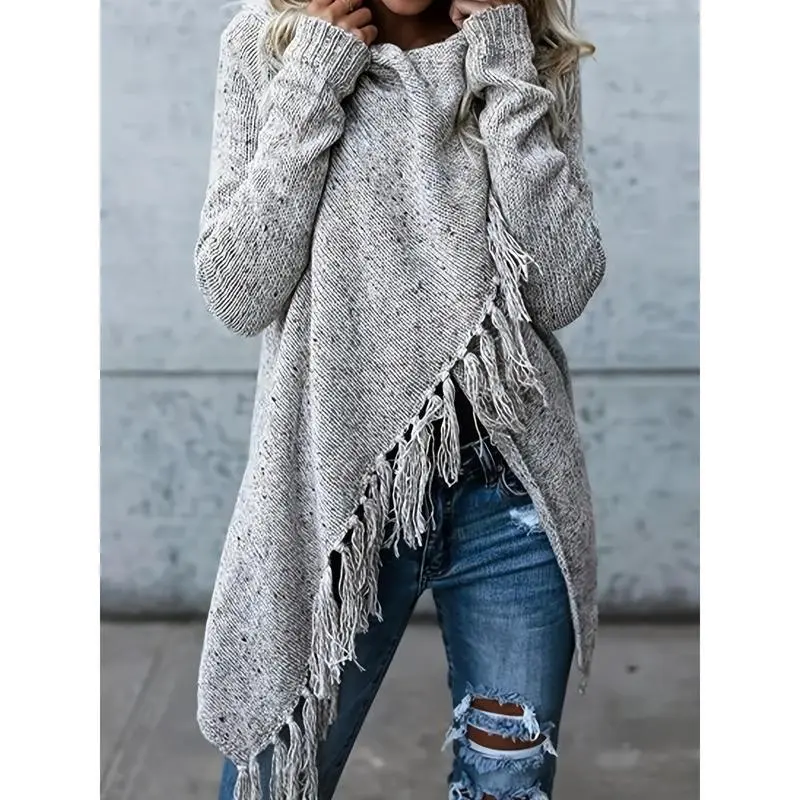 Fringe Hem Button Front Poncho Cardigan, Elegant Long Sleeve Cross Hem Cardigan For Fall & Winter, Women's Clothing Piece Tops Womenswear Aesthetic