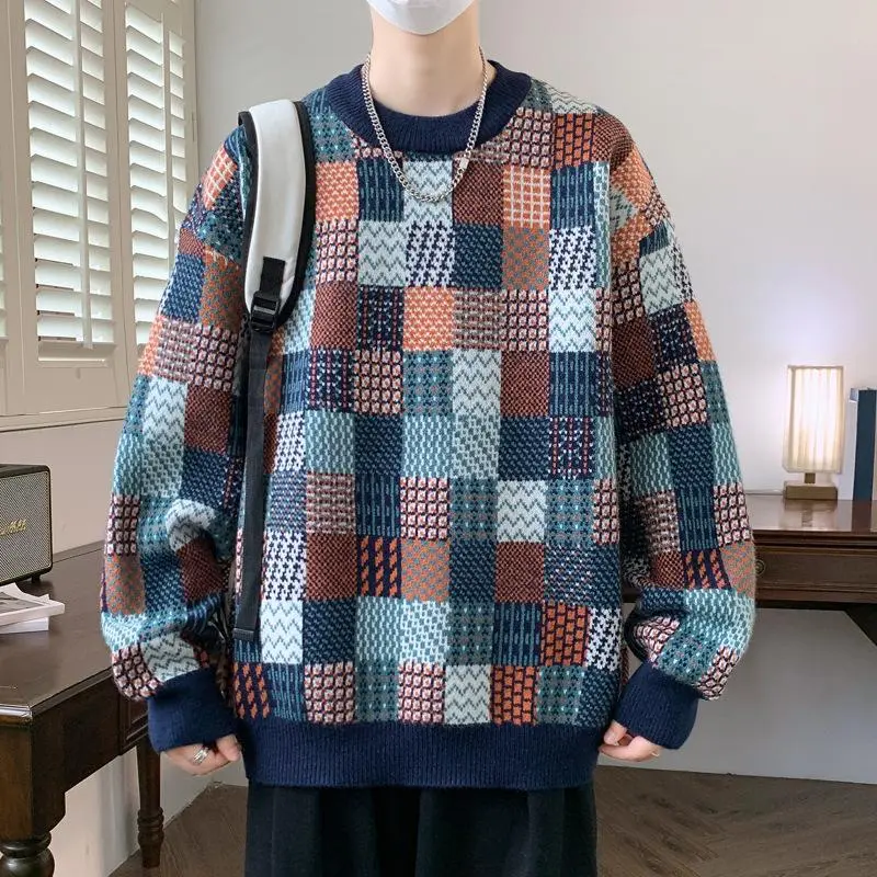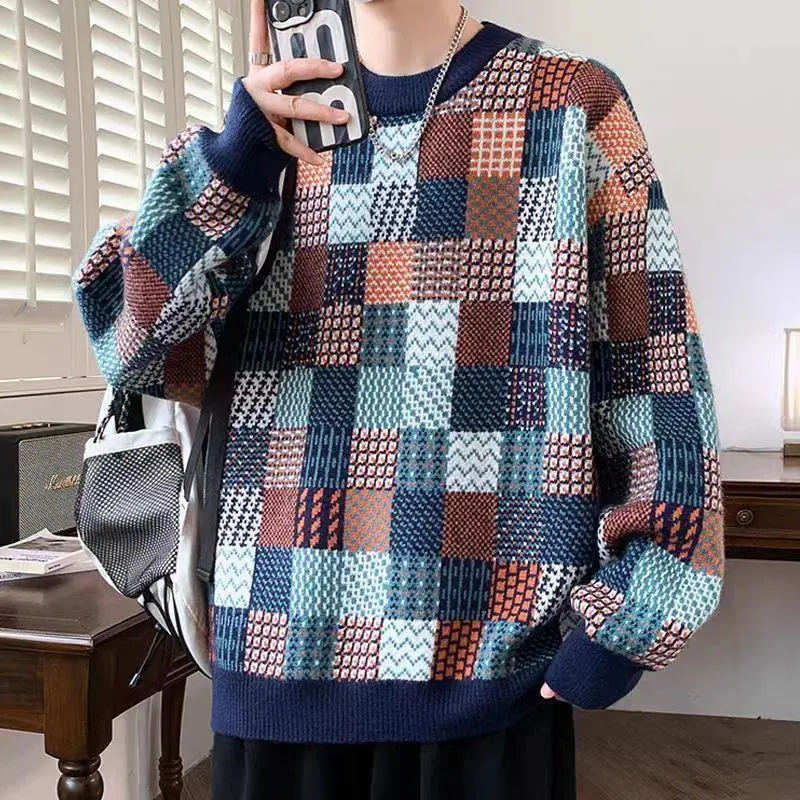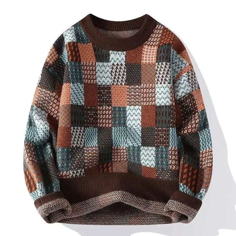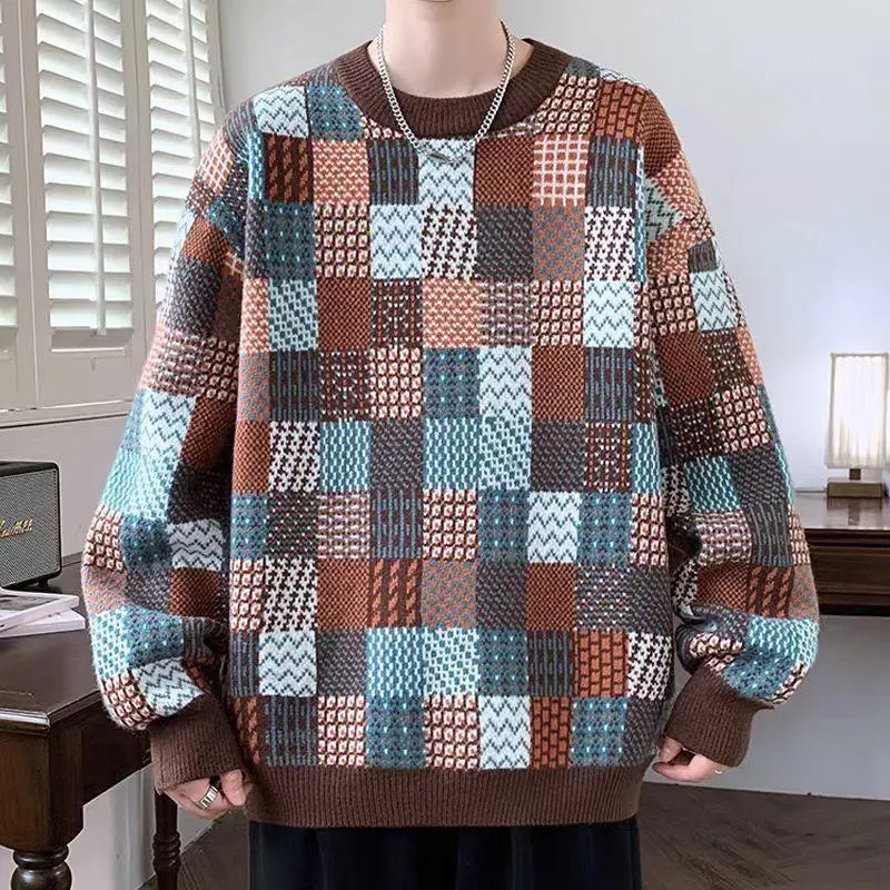 Men's All Match Sweater, Casual, Cool, Warm and Thick, New Round Neck, Loose Base Trendy Checkered Knit Sweater Top Knitwear Menswear