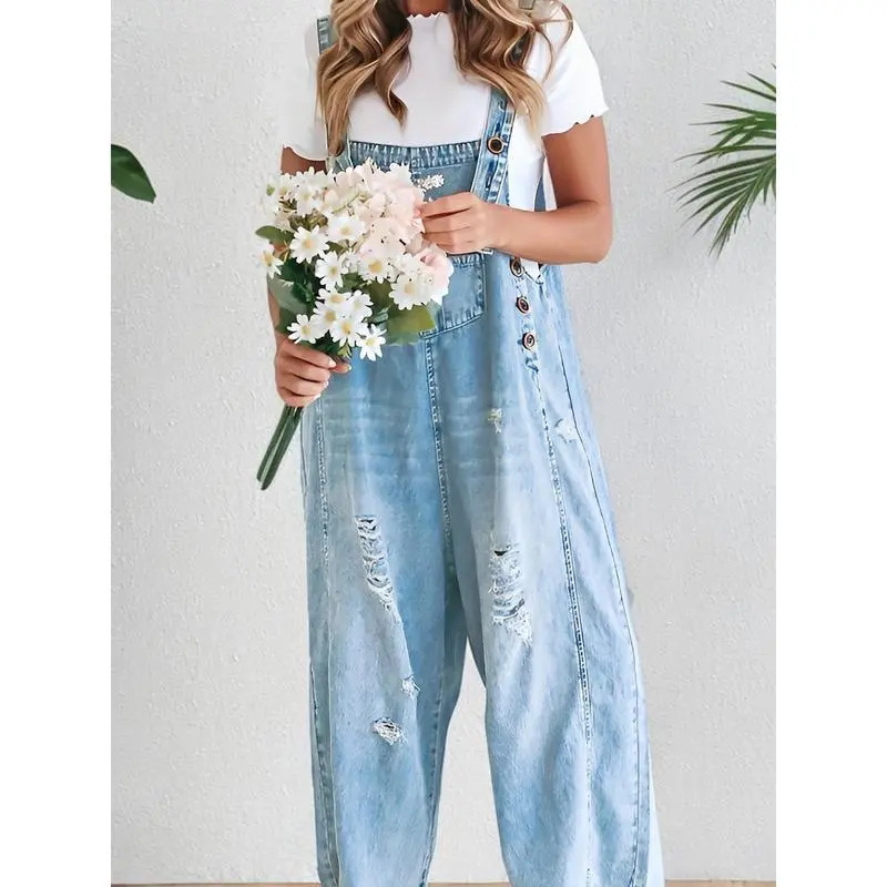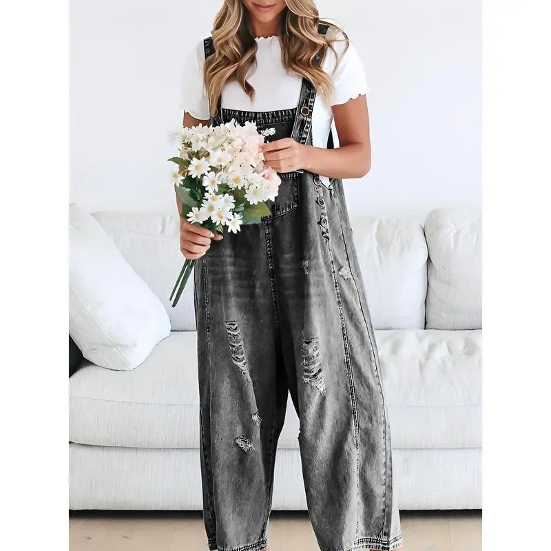 [Distressed Denim Overalls] Loose Fit Denim Overalls - Women's Casual Adjustable Strap Distressed Bib Jeans Jumpsuits With Pocket Fabric Polyester